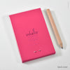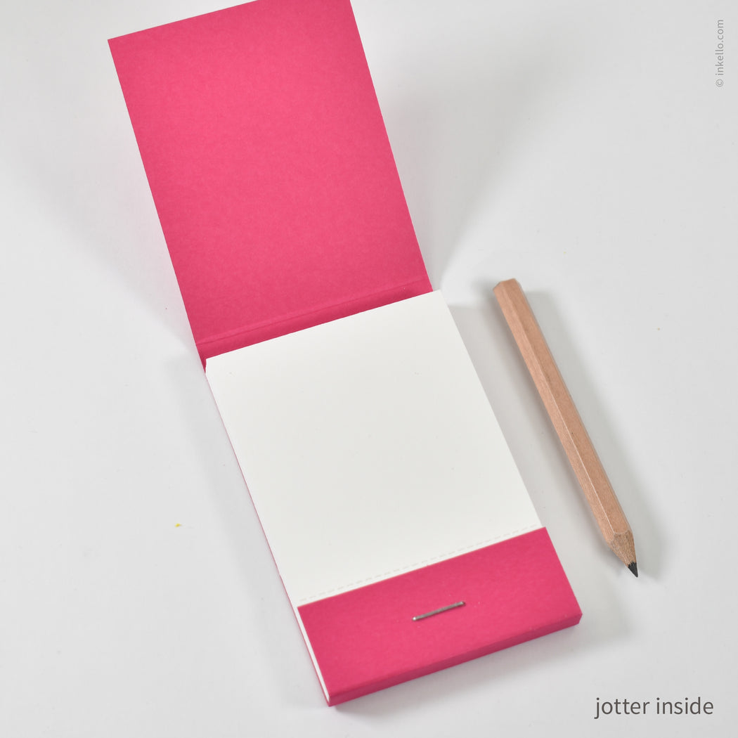 Hot pink matchbook jotter with eighteen tear-out pages, perfect for Valentine's Day. Cover features a hand-drawn heart with lettering that reads "be mine." White inside pages are perforated at the bottom to easily tear out. A small pencil is included. Fits easily in a pocket or bag for scribbling a quick note.