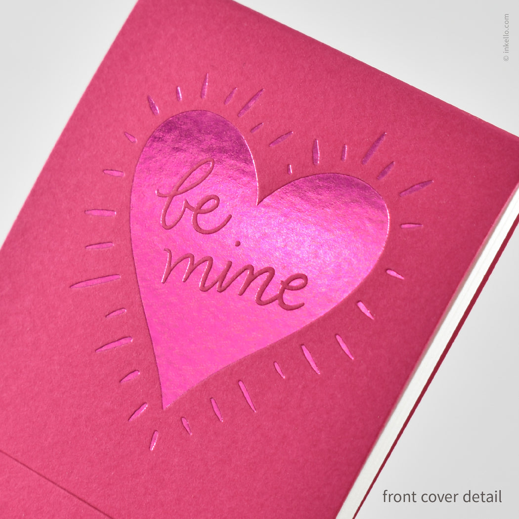Front: "be mine" and heart printed in hot pink metallic foil on hot pink paper