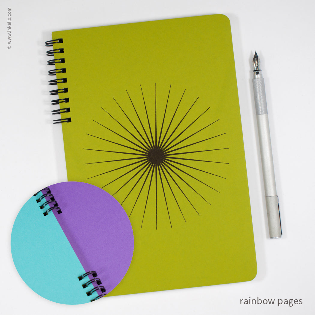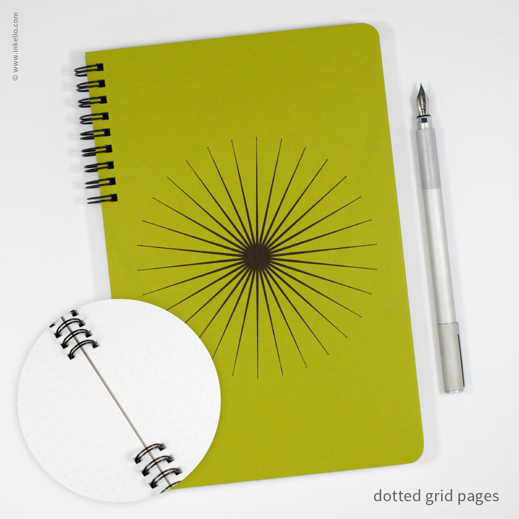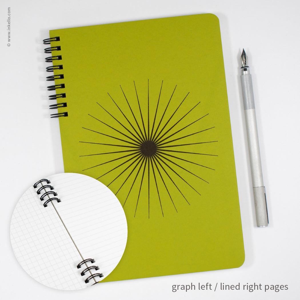 A giant bold burst printed in black ink is centered on the front cover of this spiral-bound notebook. Each spiral notebook is made to order. Choose from a variety of page formats for the inside: