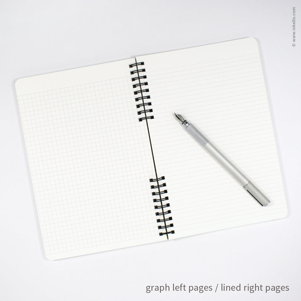 - Lined / graph: white pages with grey 0.2" lines on left / grey 0.2" solid graph on right (55 pages)