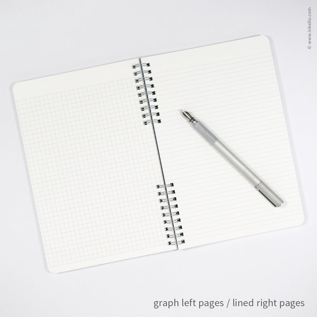 - Lined / graph: white pages with grey 0.2" lines on left / grey 0.2" solid graph on right (55 pages)