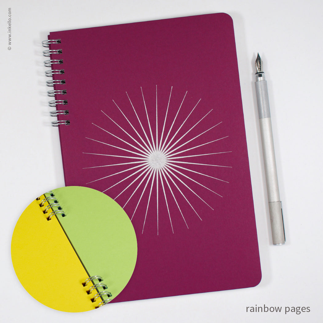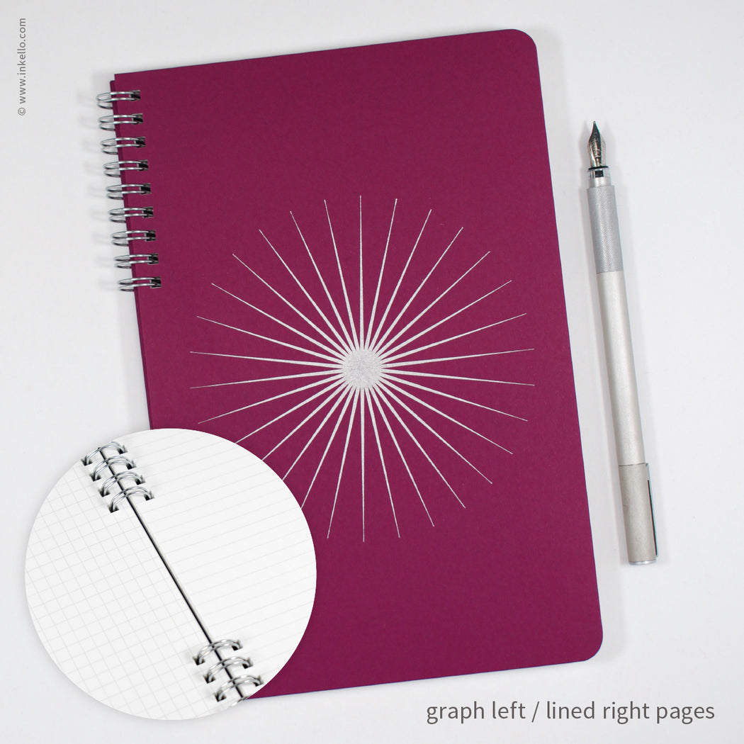 A giant bold burst printed in silver ink is centered on the front cover of this spiral-bound notebook. Each spiral notebook is made to order. Choose from a variety of page formats for the inside:
