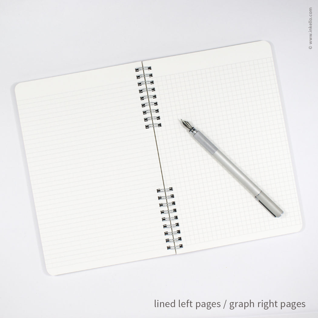- Lined / graph: white pages with grey 0.2" lines on left / grey 0.2" solid graph on right (55 pages)