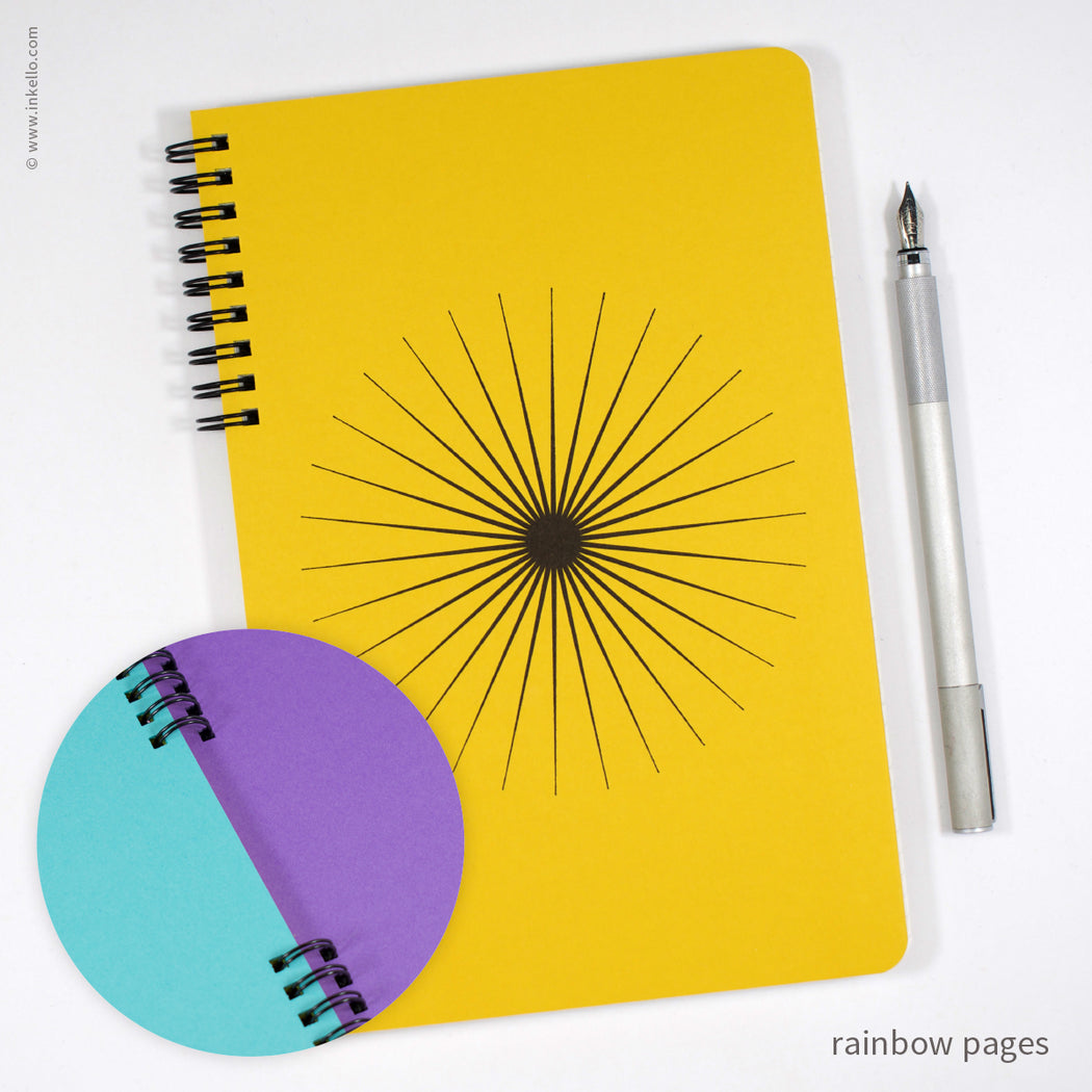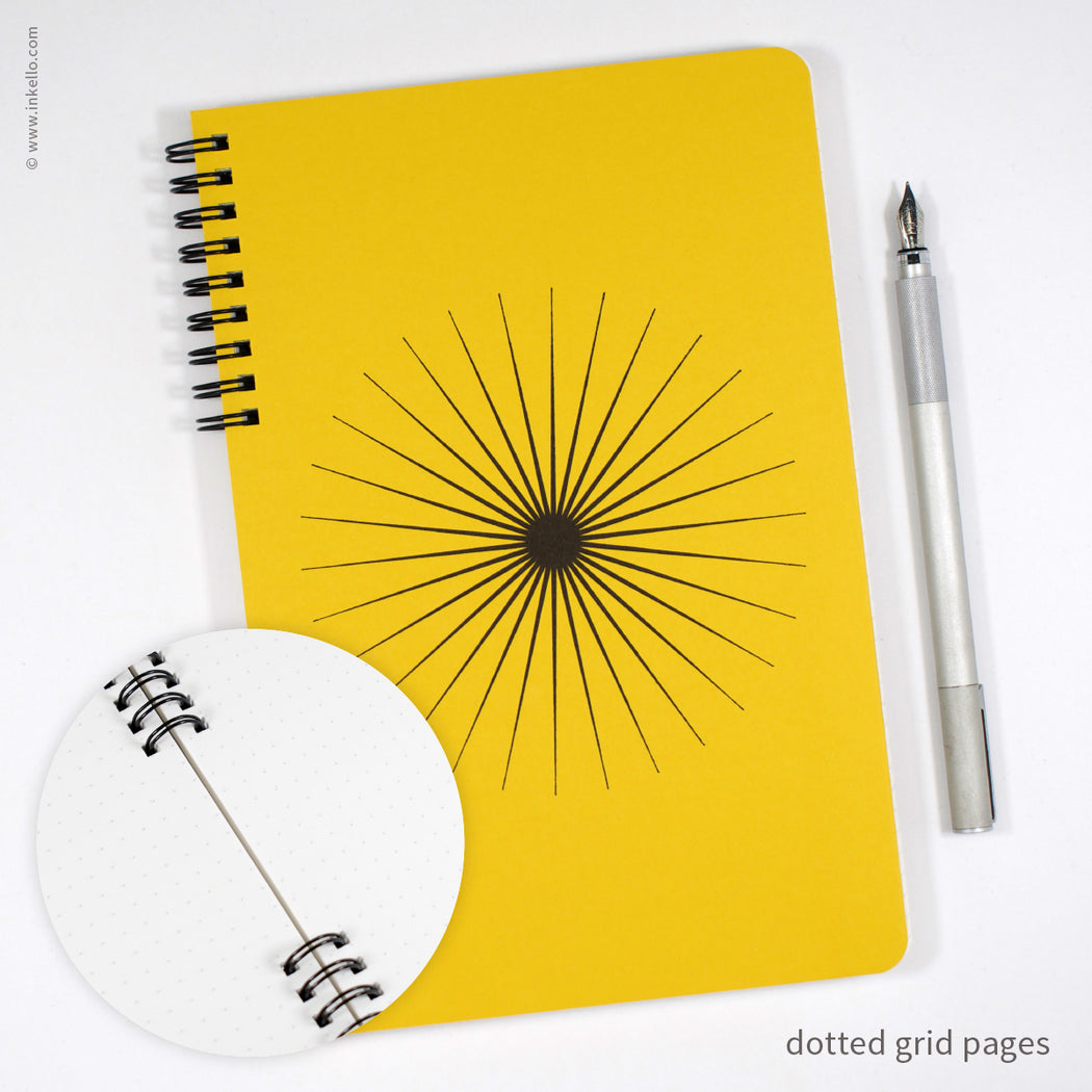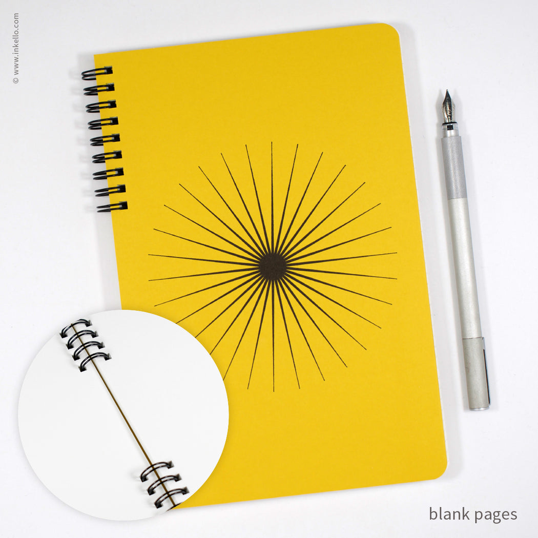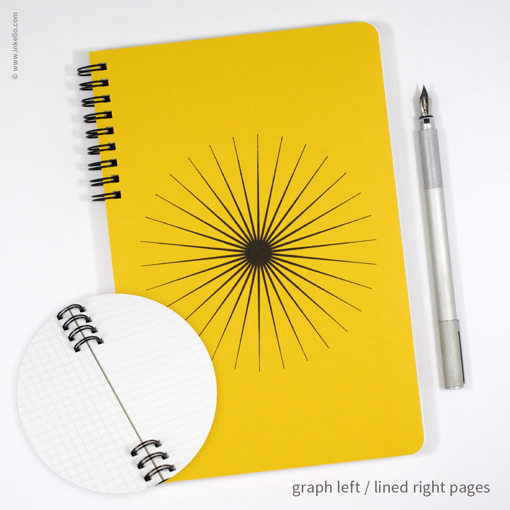 A giant bold burst printed in black ink is centered on the front cover of this spiral-bound notebook. Each spiral notebook is made to order. Choose from a variety of page formats for the inside: