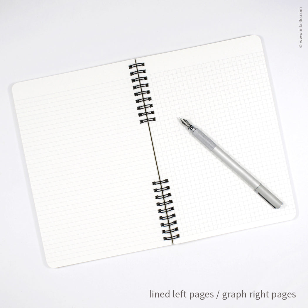 - Lined / graph: white pages with grey 0.2" lines on left / grey 0.2" solid graph on right (55 pages)