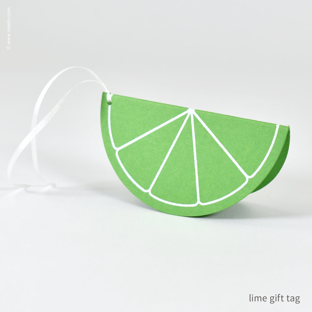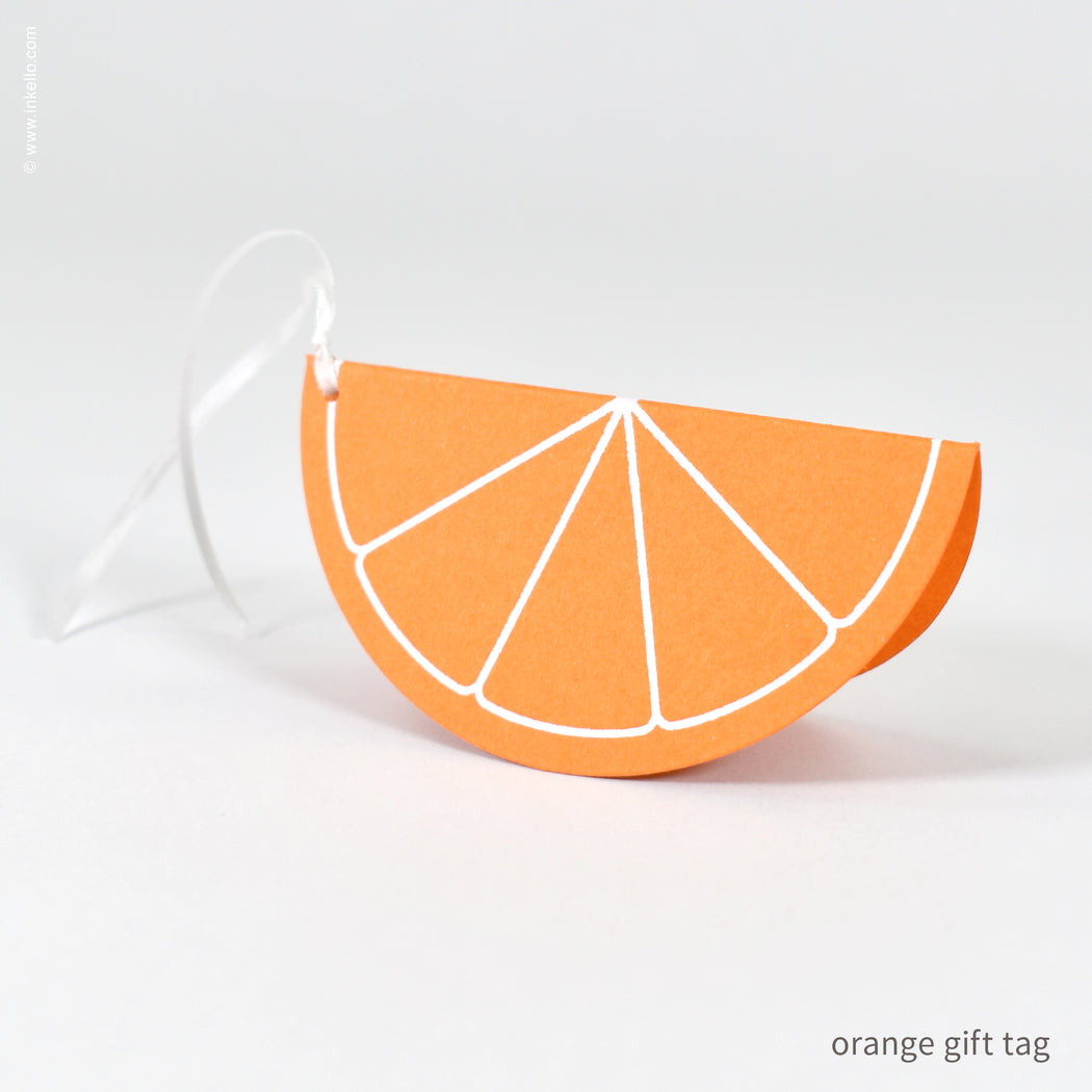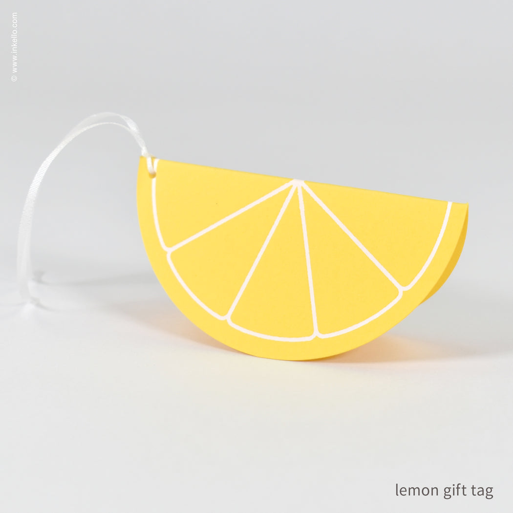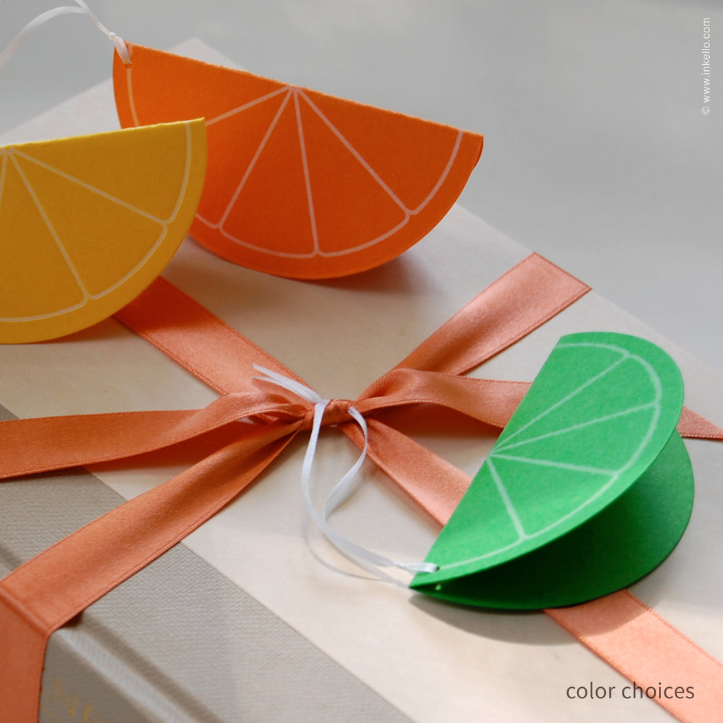Cheery gift tag shaped like a half-moon slice of lemon, lime or orange. Thin white silk ribbon for tying to your gift.