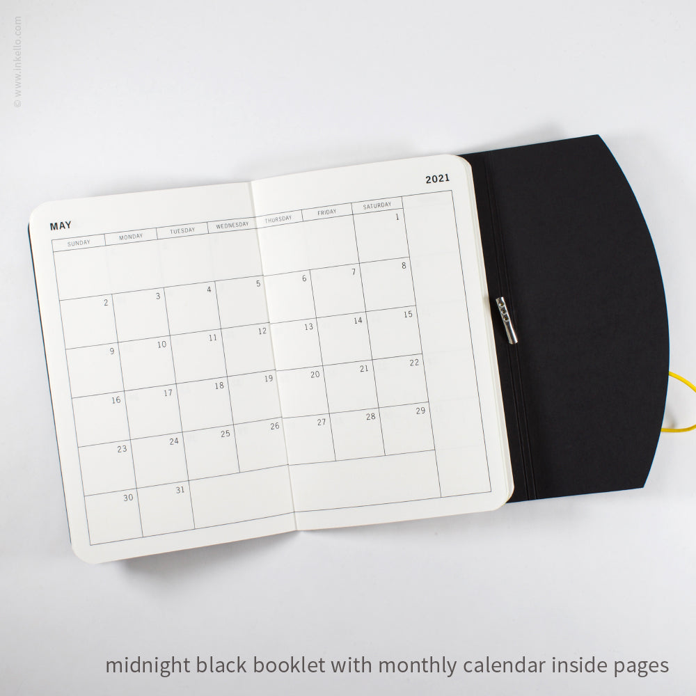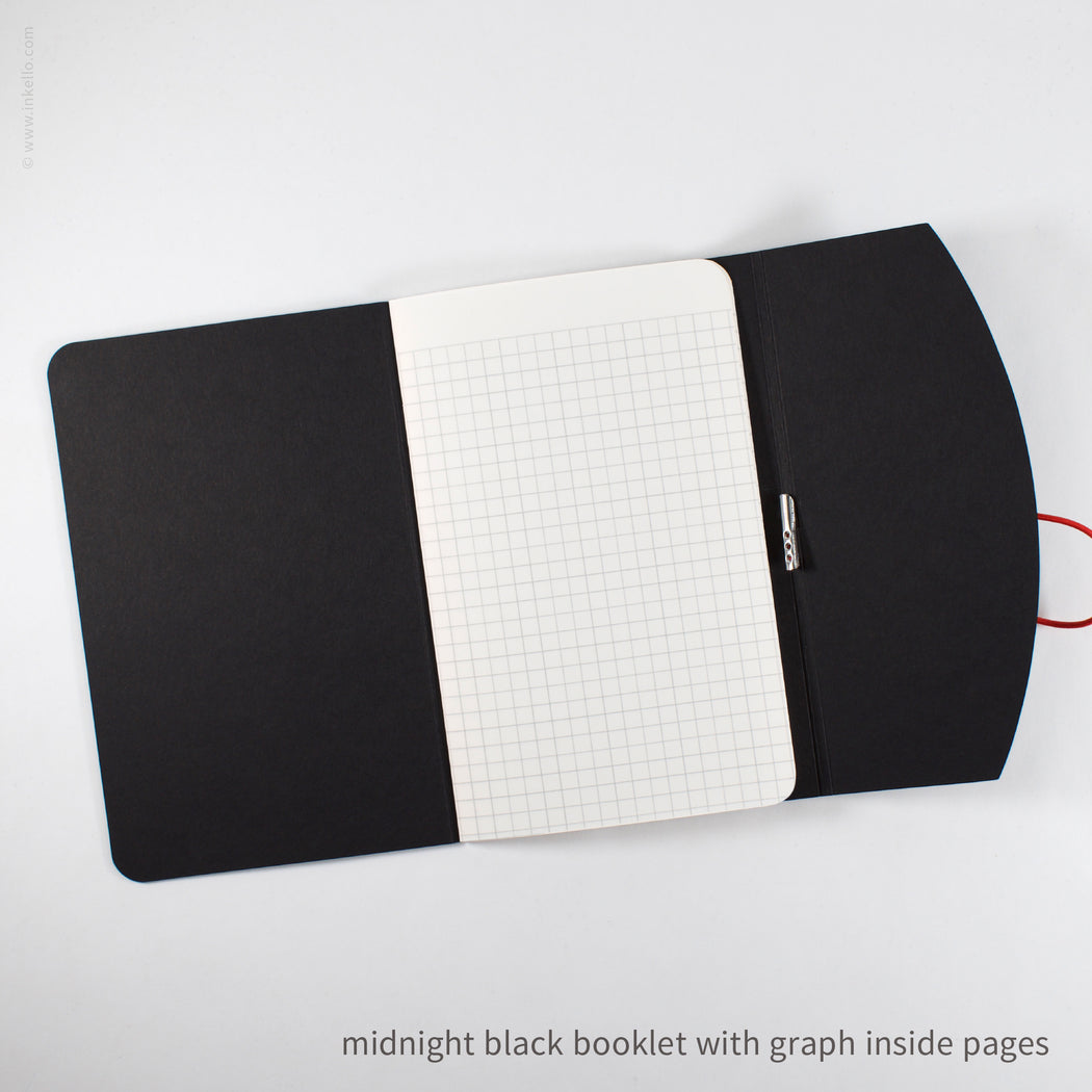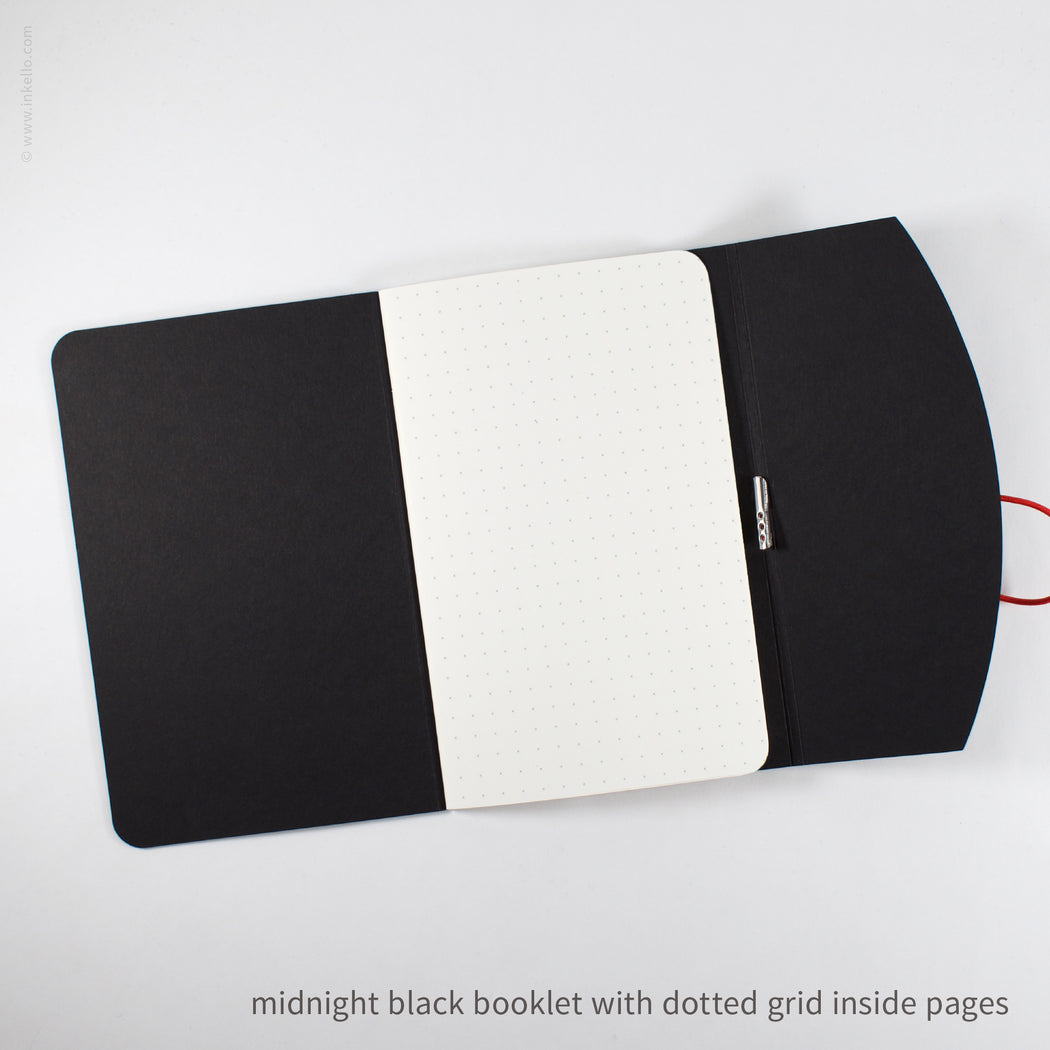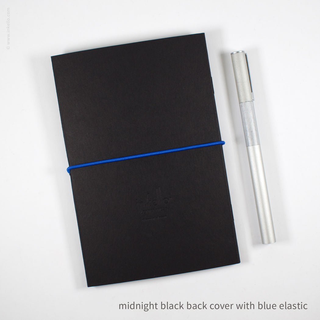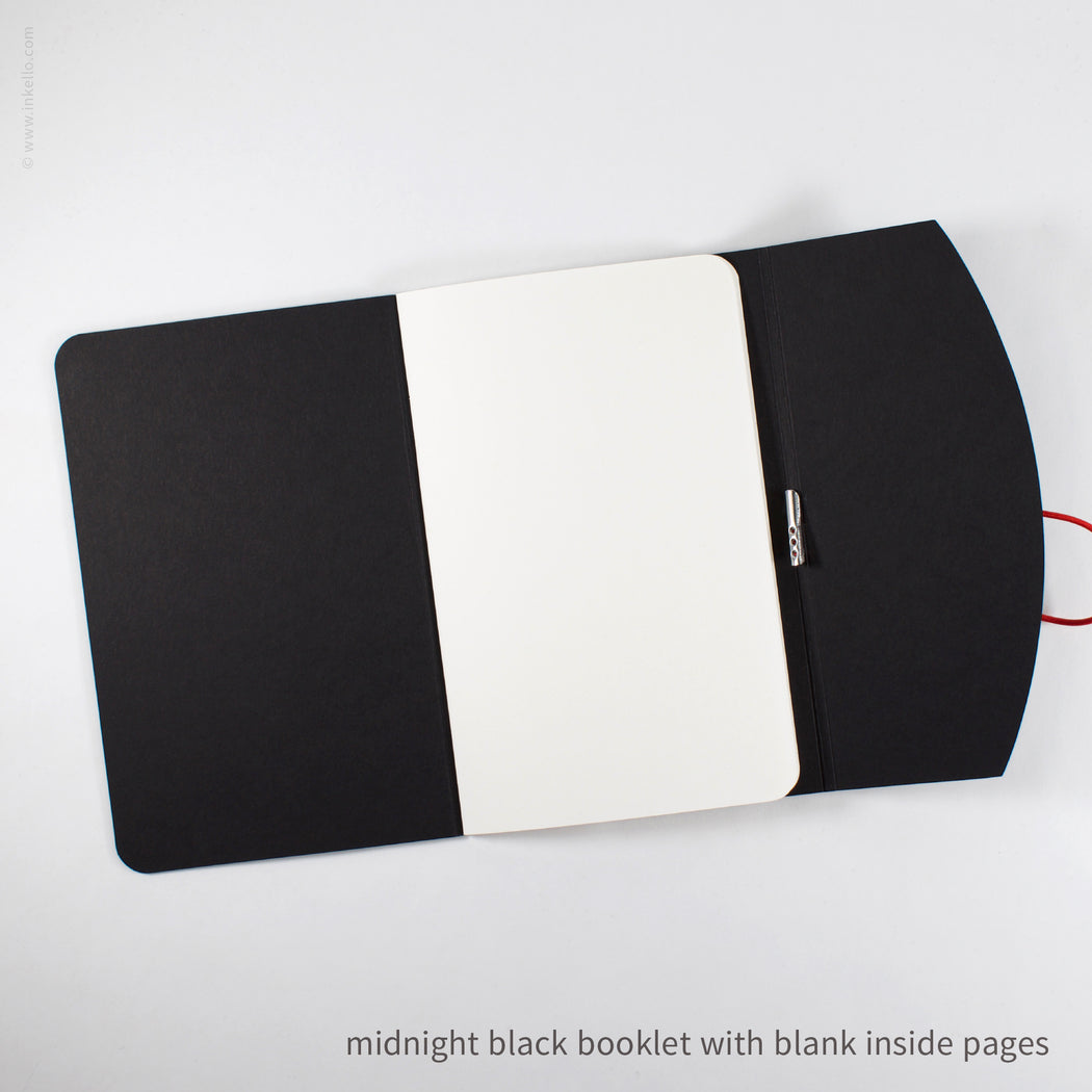 Materials: heavy midnight black paper for cover, white text-weight paper for inside pages, red, yellow or blue 2mm elastic band with silver-tone barb