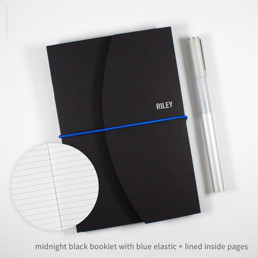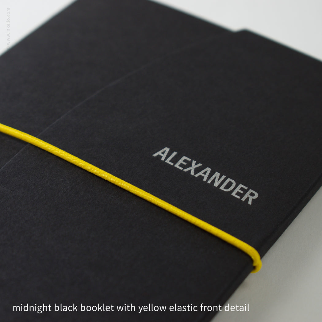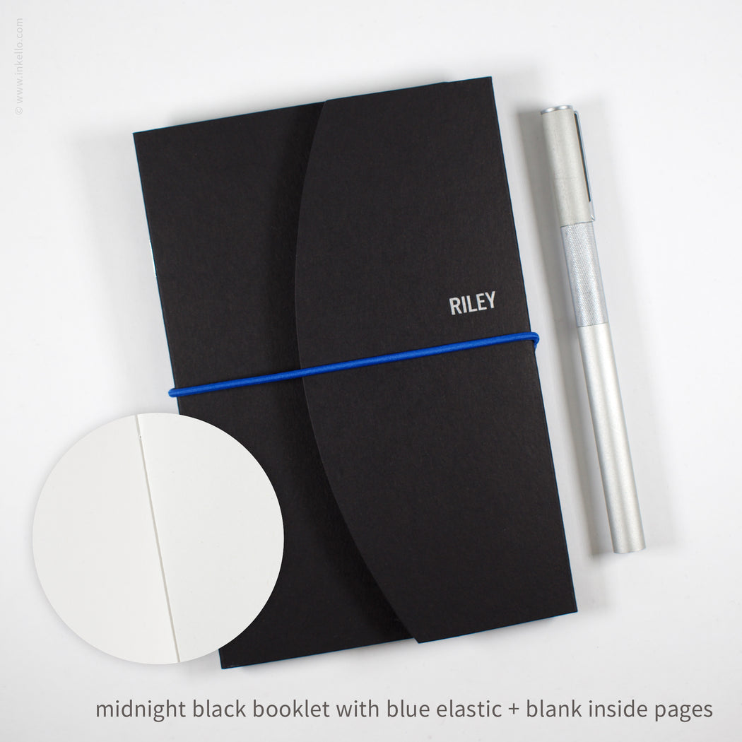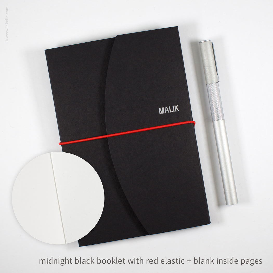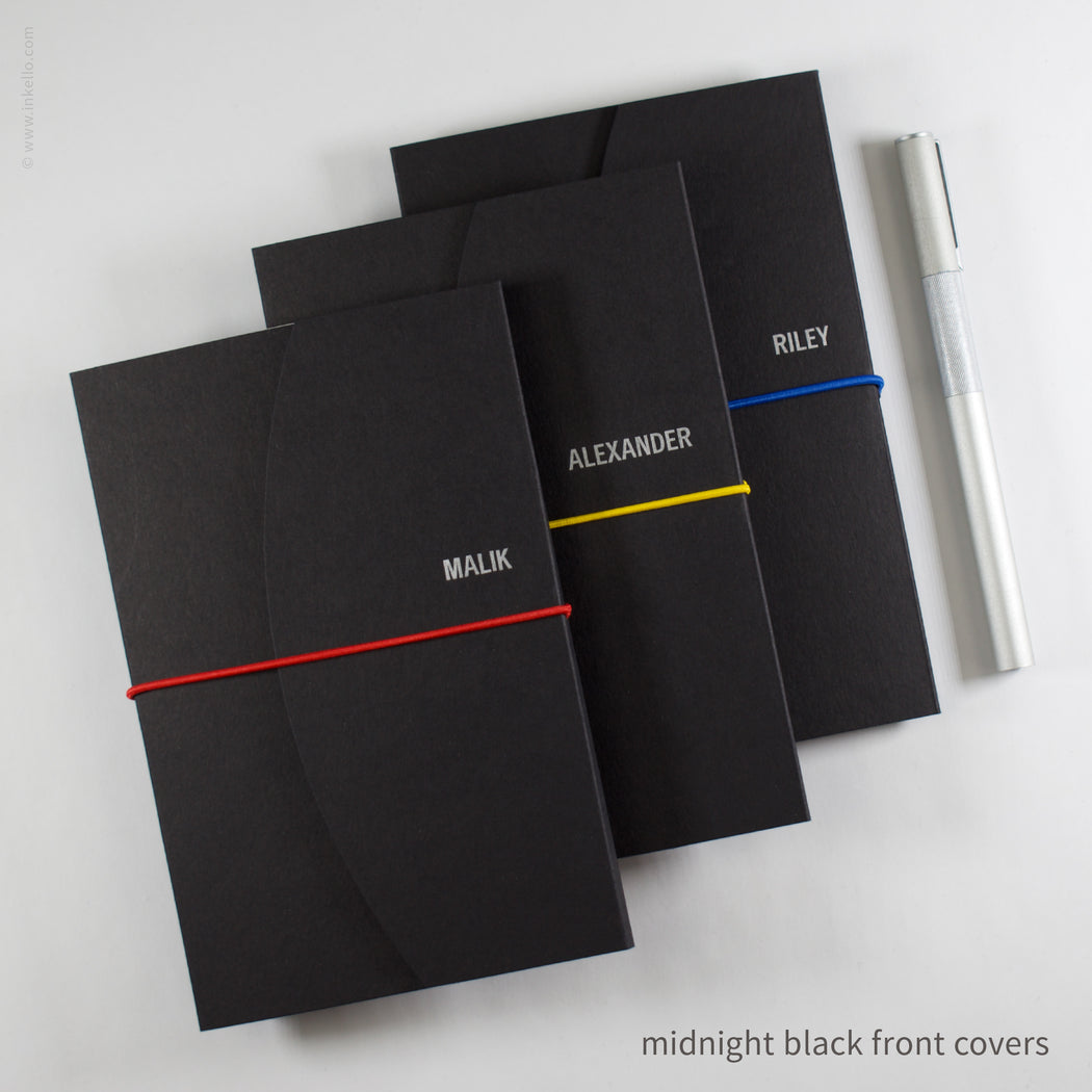 Simple, personalized booklet printed in metallic silver letterpress ink with handset metal type on a thick, midnight black cover. Cover is die-cut with a graceful curve and wraps all the way around the booklet to protect the inside pages. Booklet is fastened with your choice of a red, yellow or blue elastic loop.