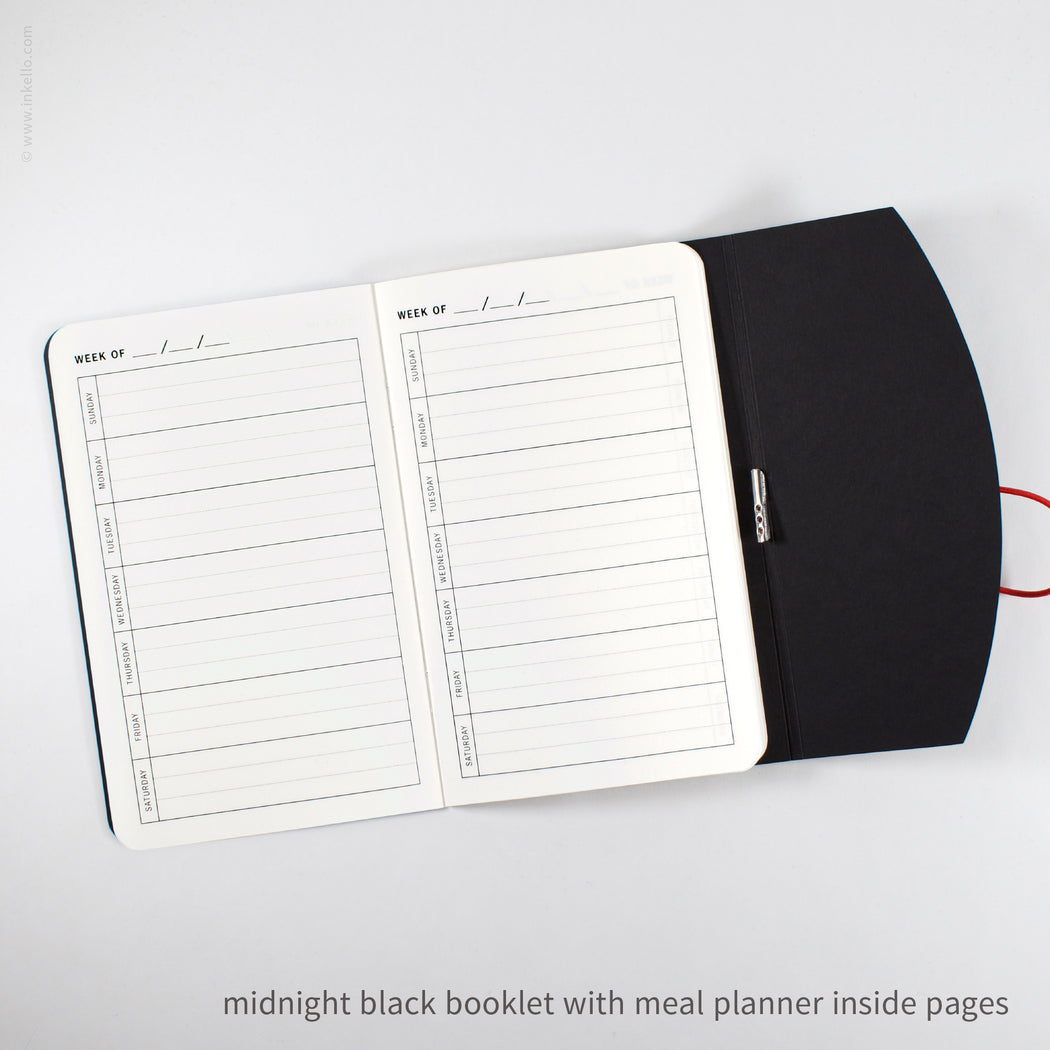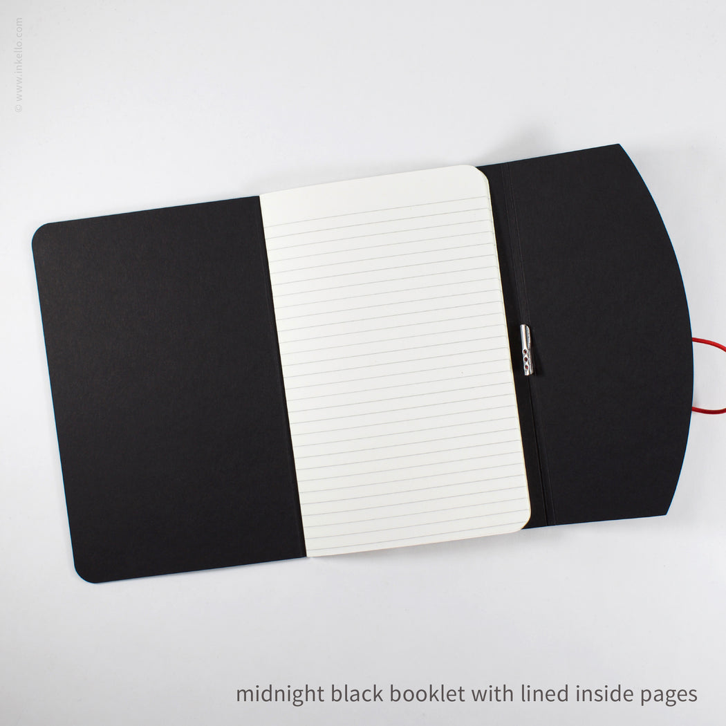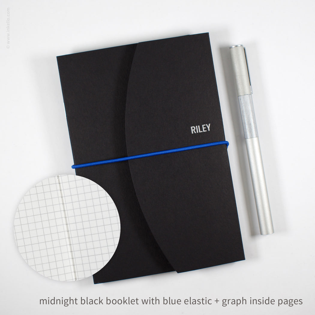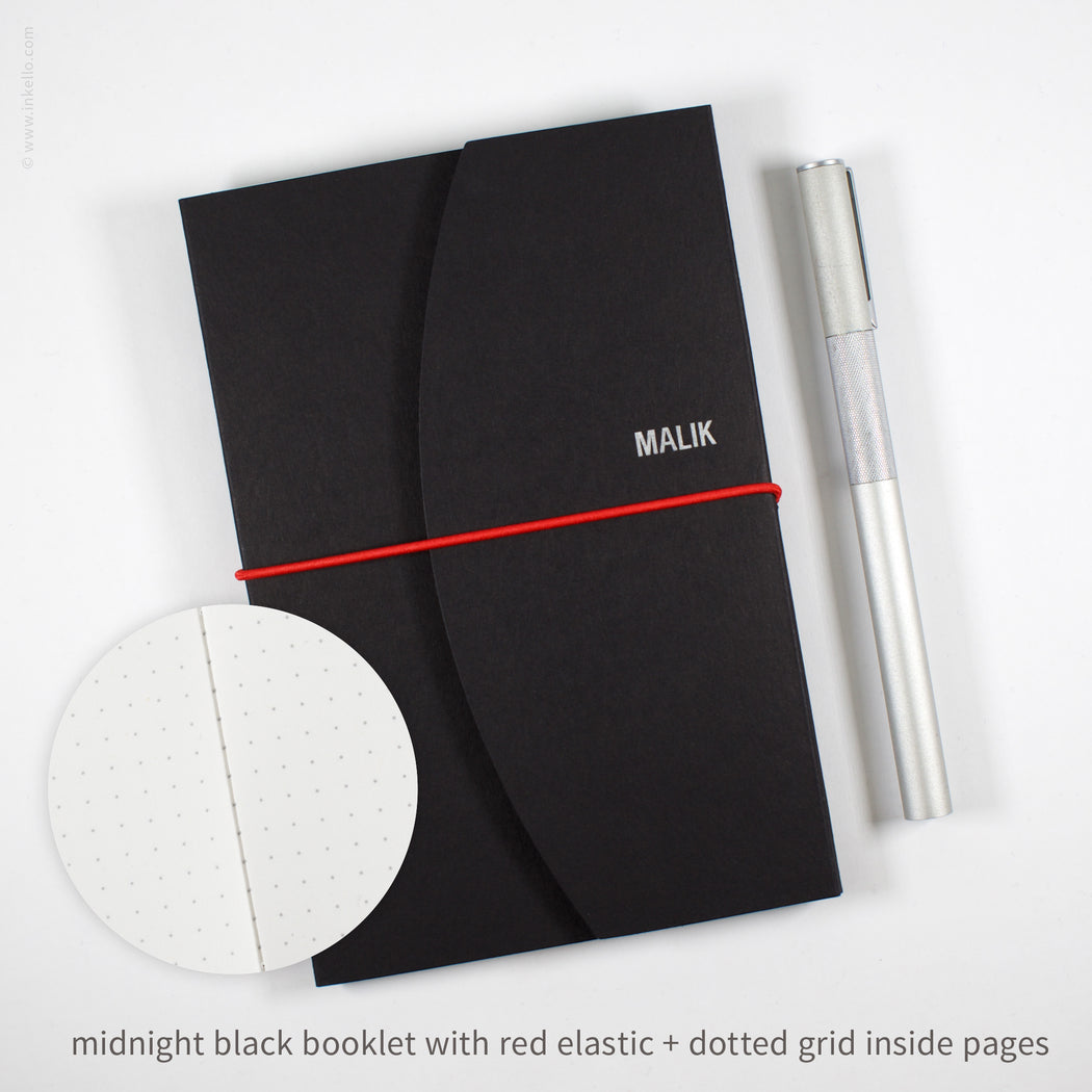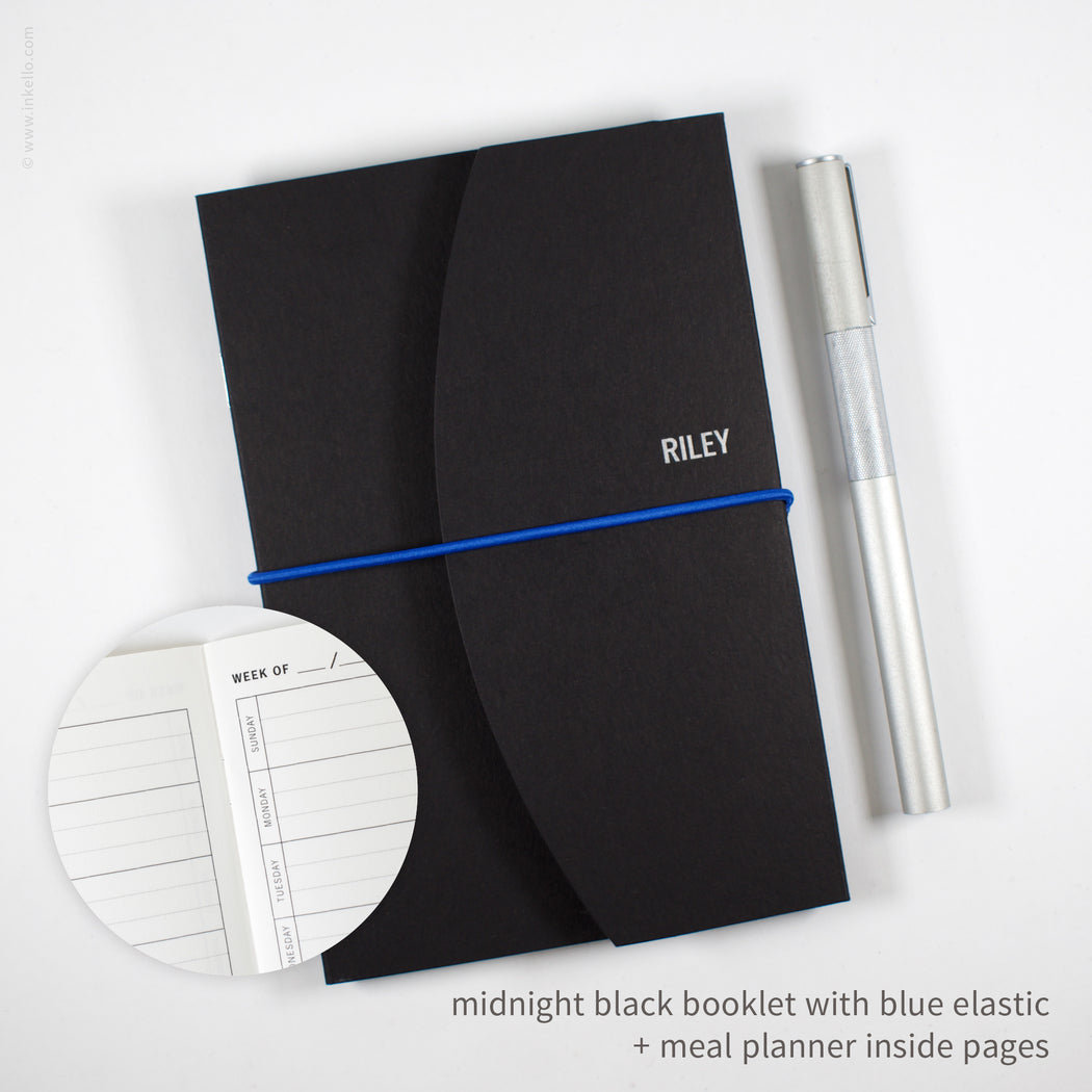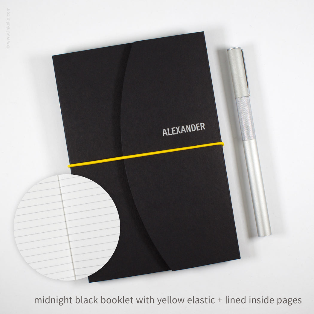 Simple, personalized booklet printed in metallic silver letterpress ink with handset metal type on a thick, midnight black cover. Cover is die-cut with a graceful curve and wraps all the way around the booklet to protect the inside pages. Booklet is fastened with your choice of a red, yellow or blue elastic loop.