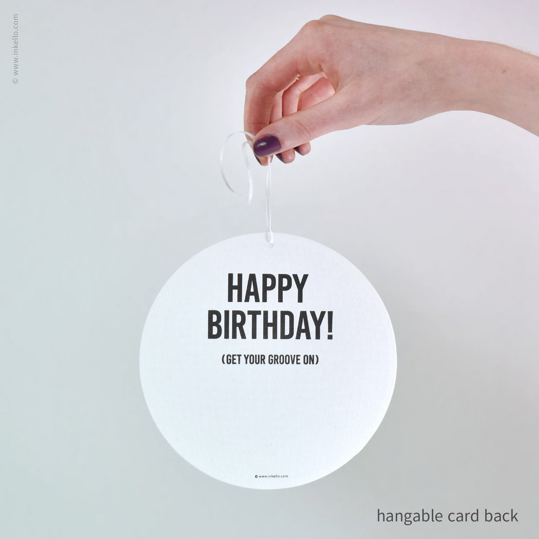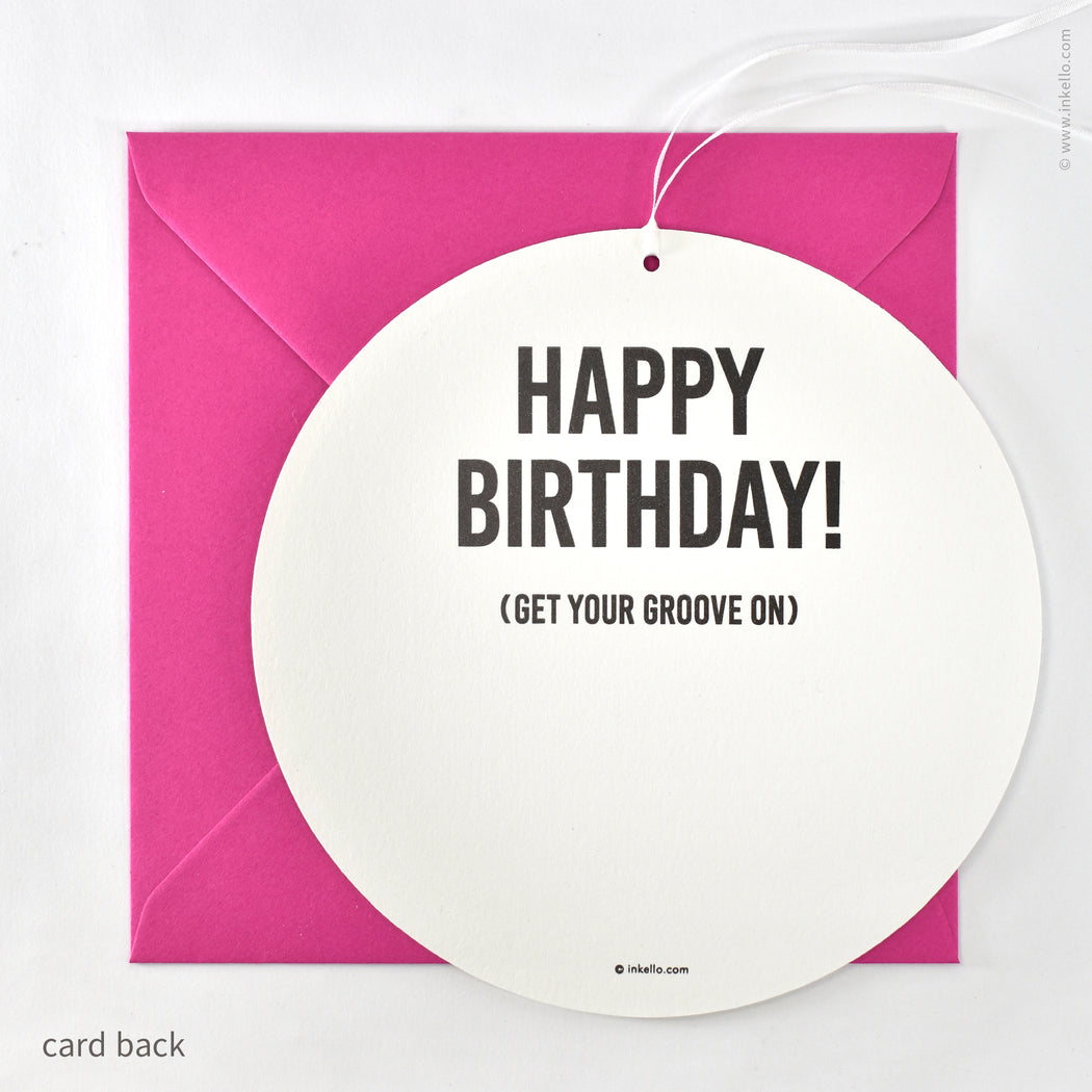 Back of card: "Happy Birthday! (Get Your Groove On) printed in black letterpress ink, Inkello web address