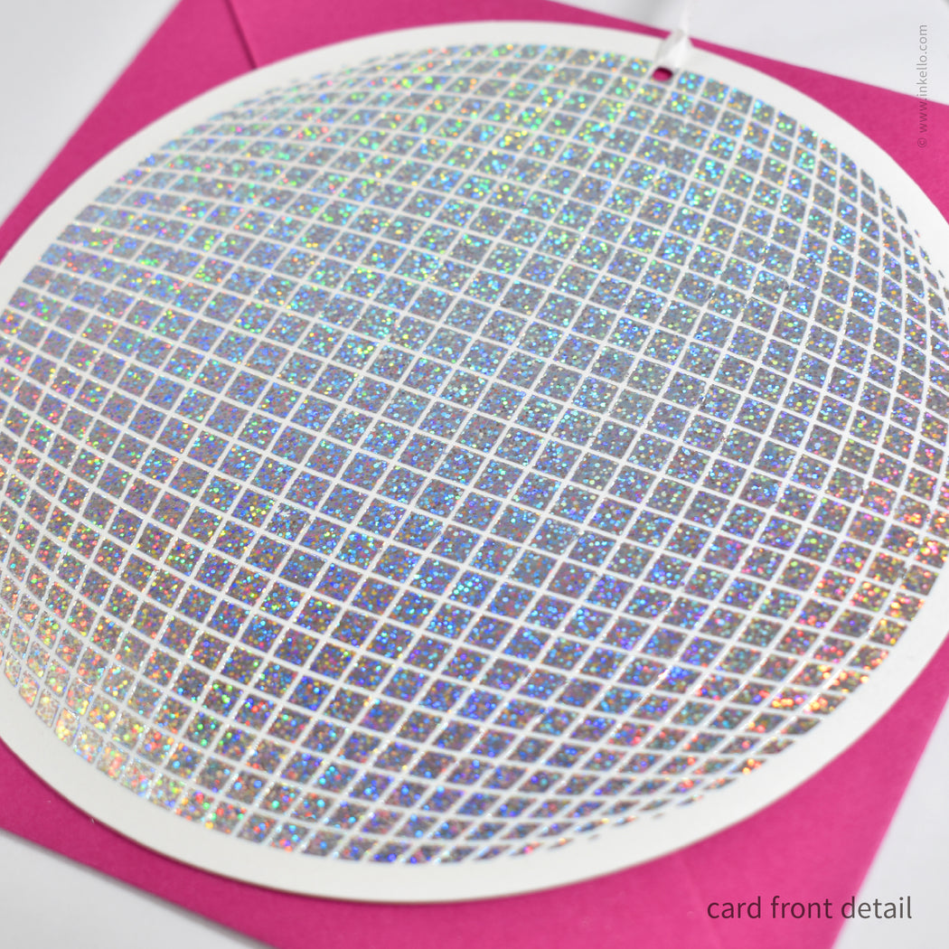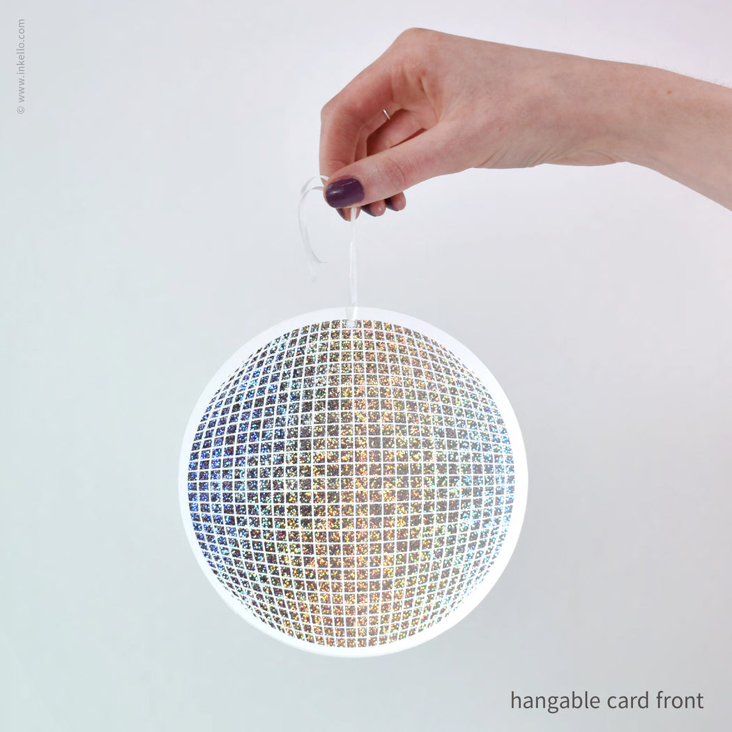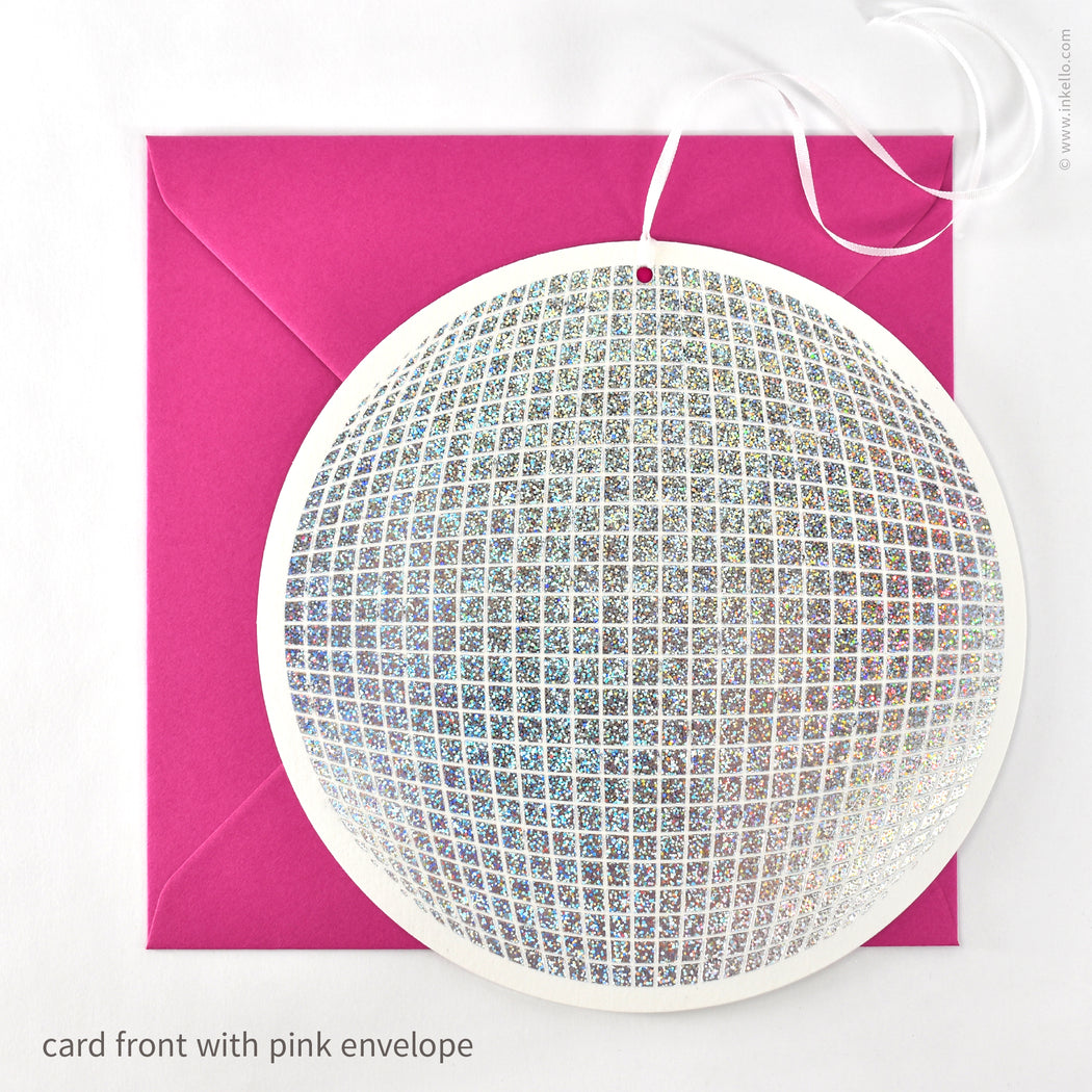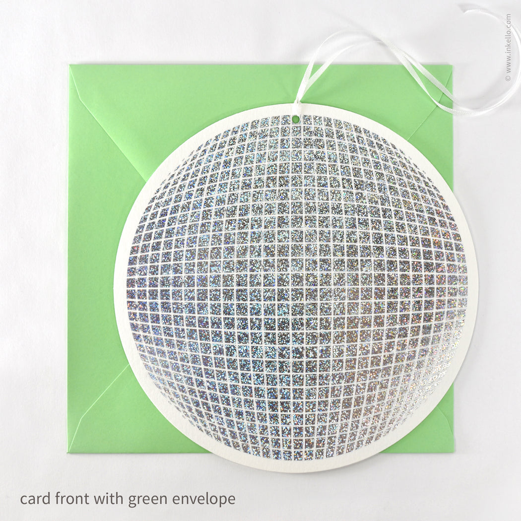 Celebrate a special birthday with this glittery and hangable circular card that looks like a disco ball! The back reads "Happy Birthday! (Get your groove on) in bold black letters, with room below for your personal message. Silk ribbon threaded at top of card. Your choice of hot pink or spring green envelope with a pointed flap. Note: square envelopes require additional postage to mail.