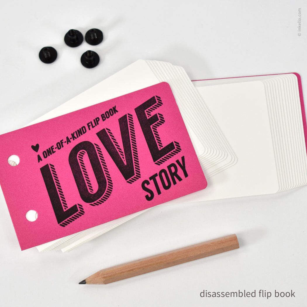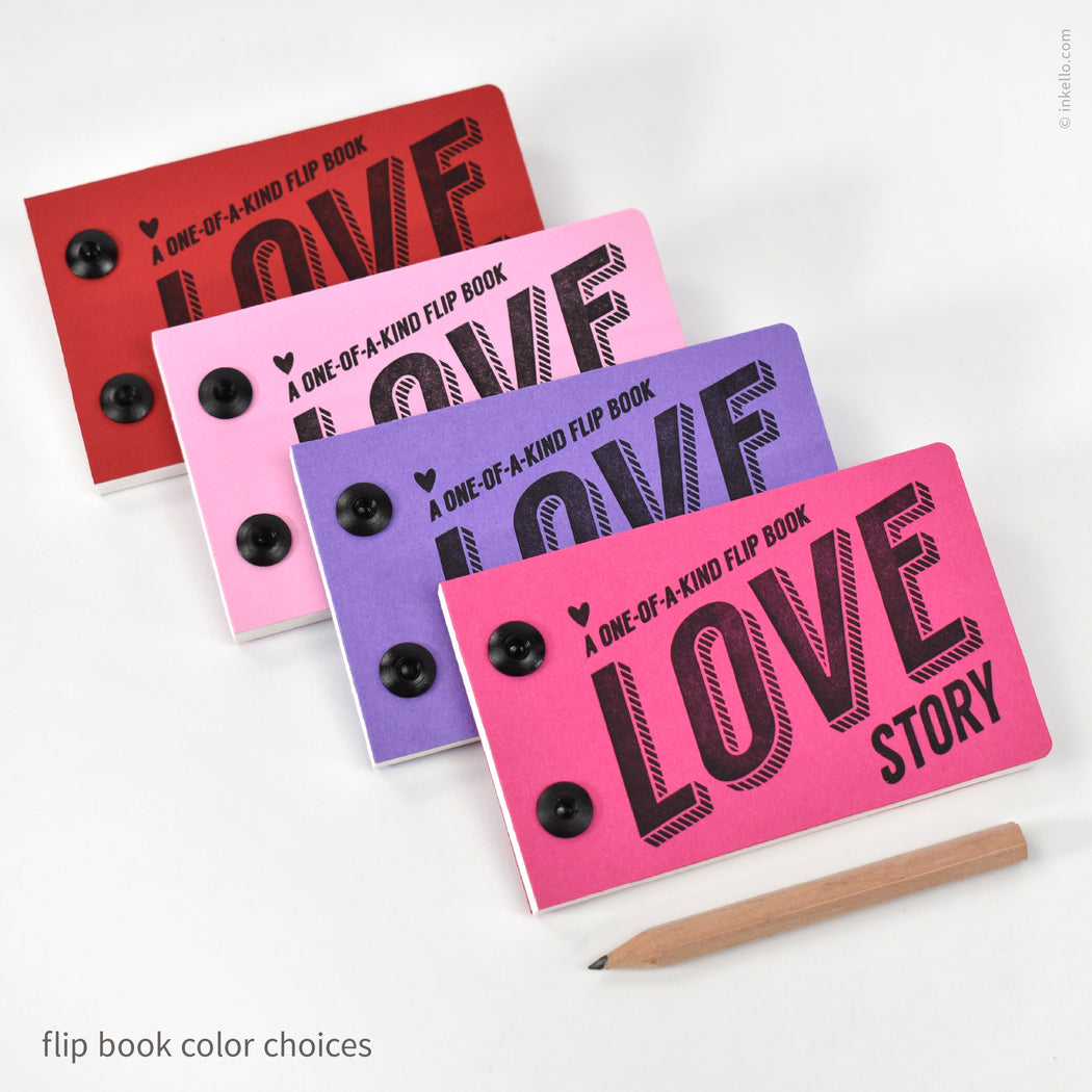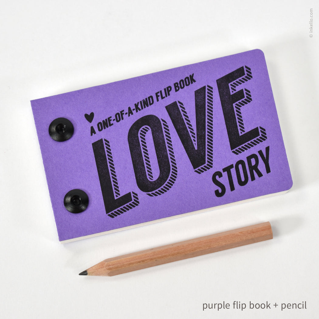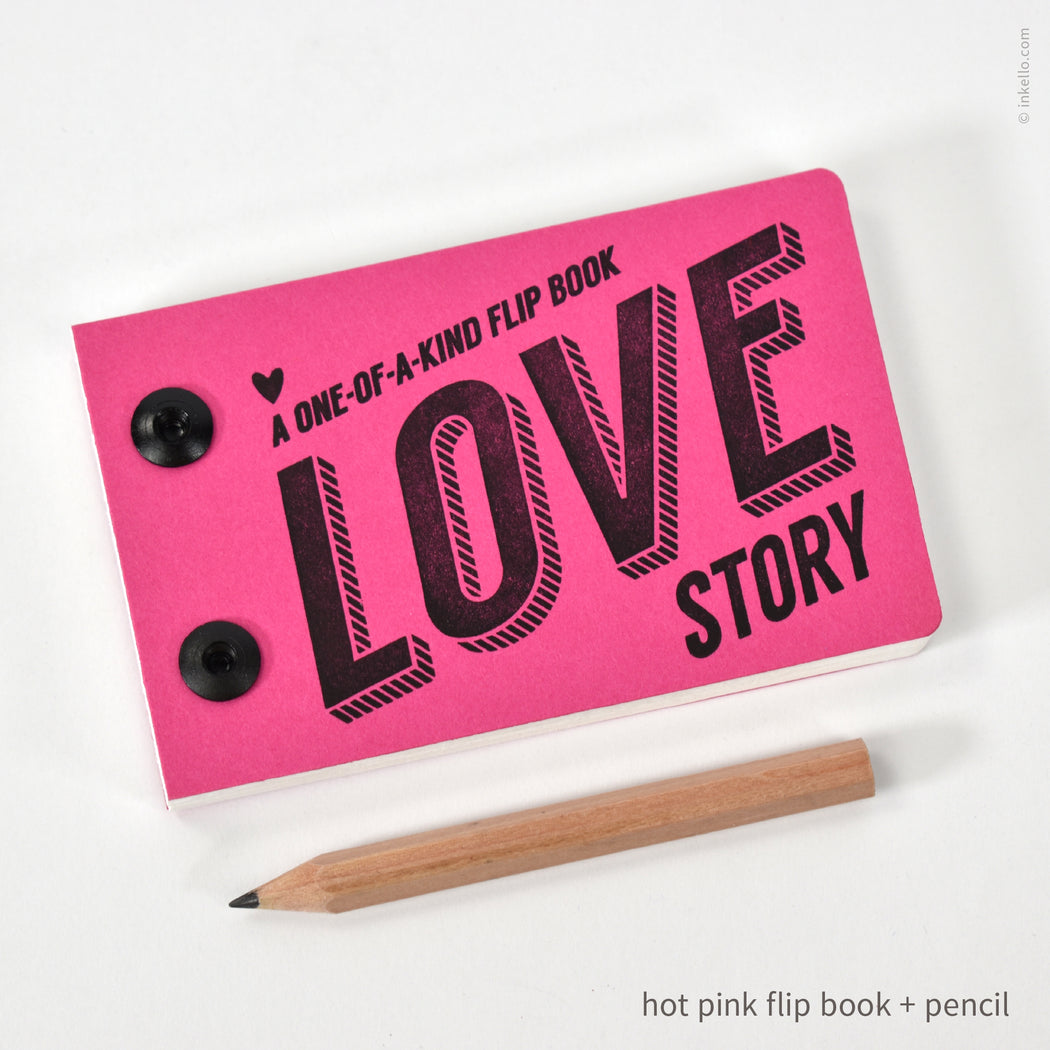 Front: "A One-of-a-Kind Flip Book Love Story" and "By" in black ink