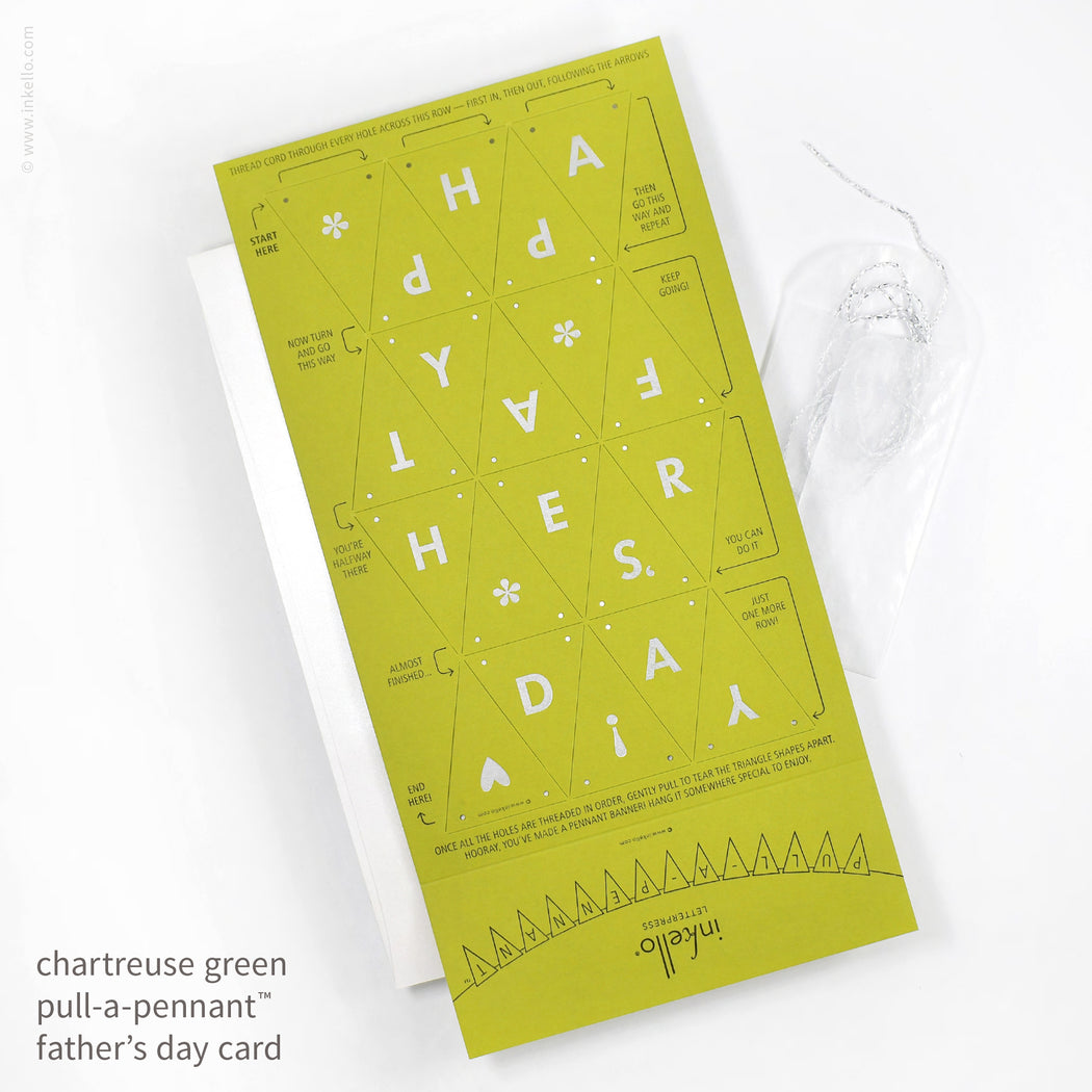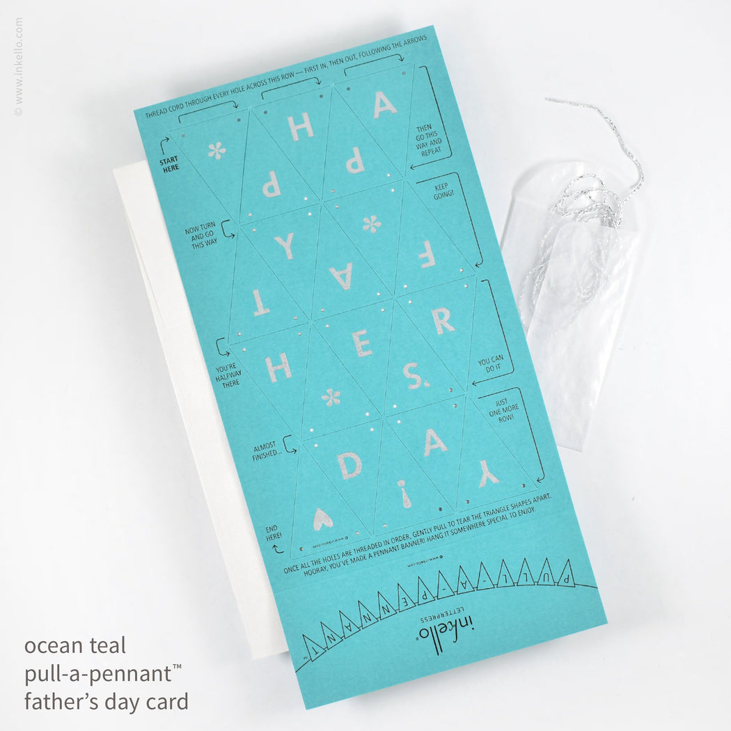 Wish Dad a Happy Father's Day with this innovative and interactive birthday card! Once he recipient threads the string through the holes in the card and pulls, the little triangles separate and line up in the right order to spell "Happy Father's Day!" on a mini hangable banner.
