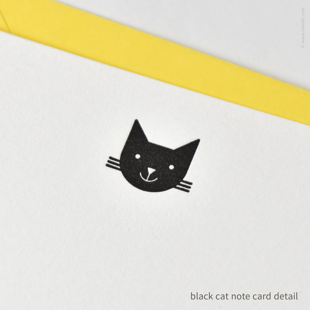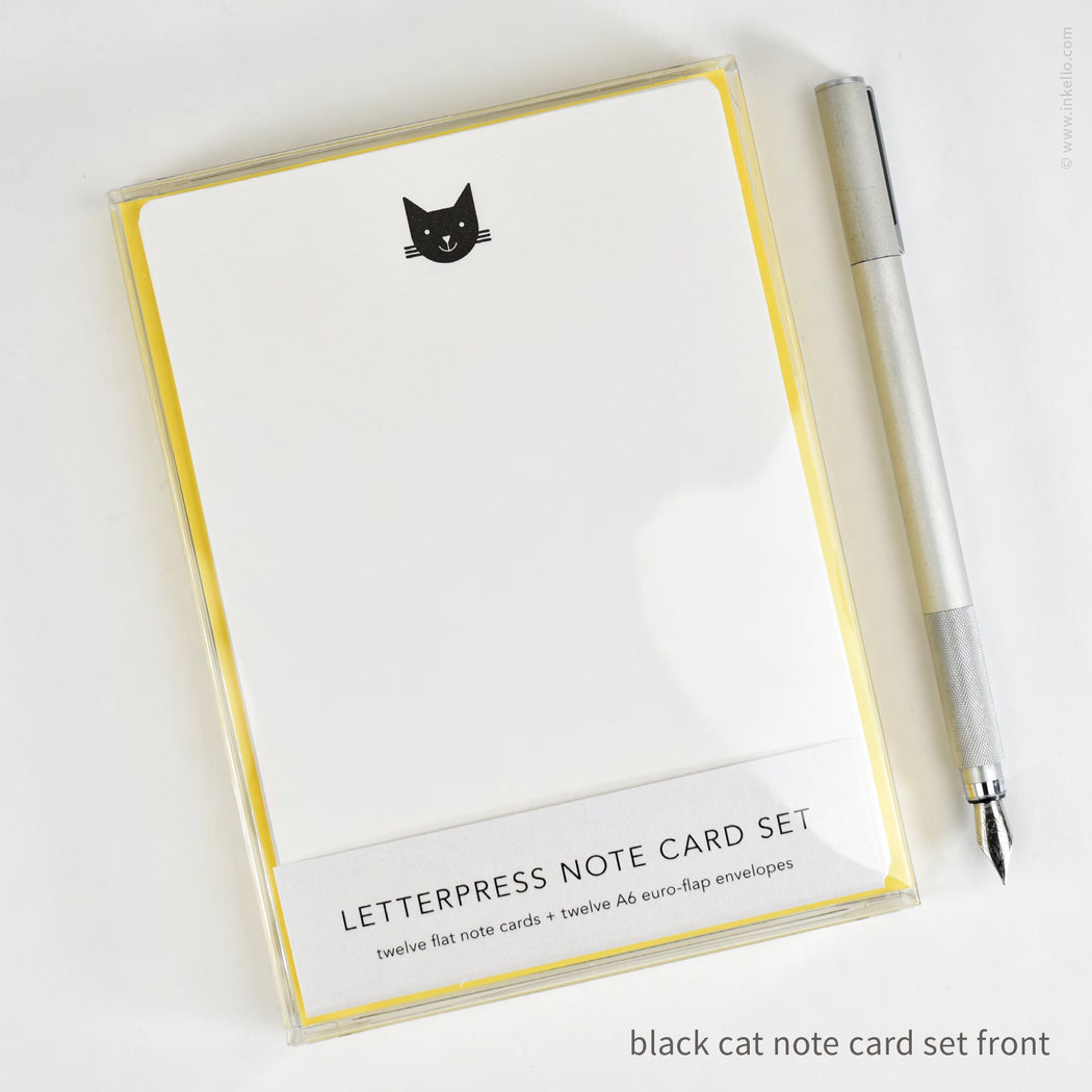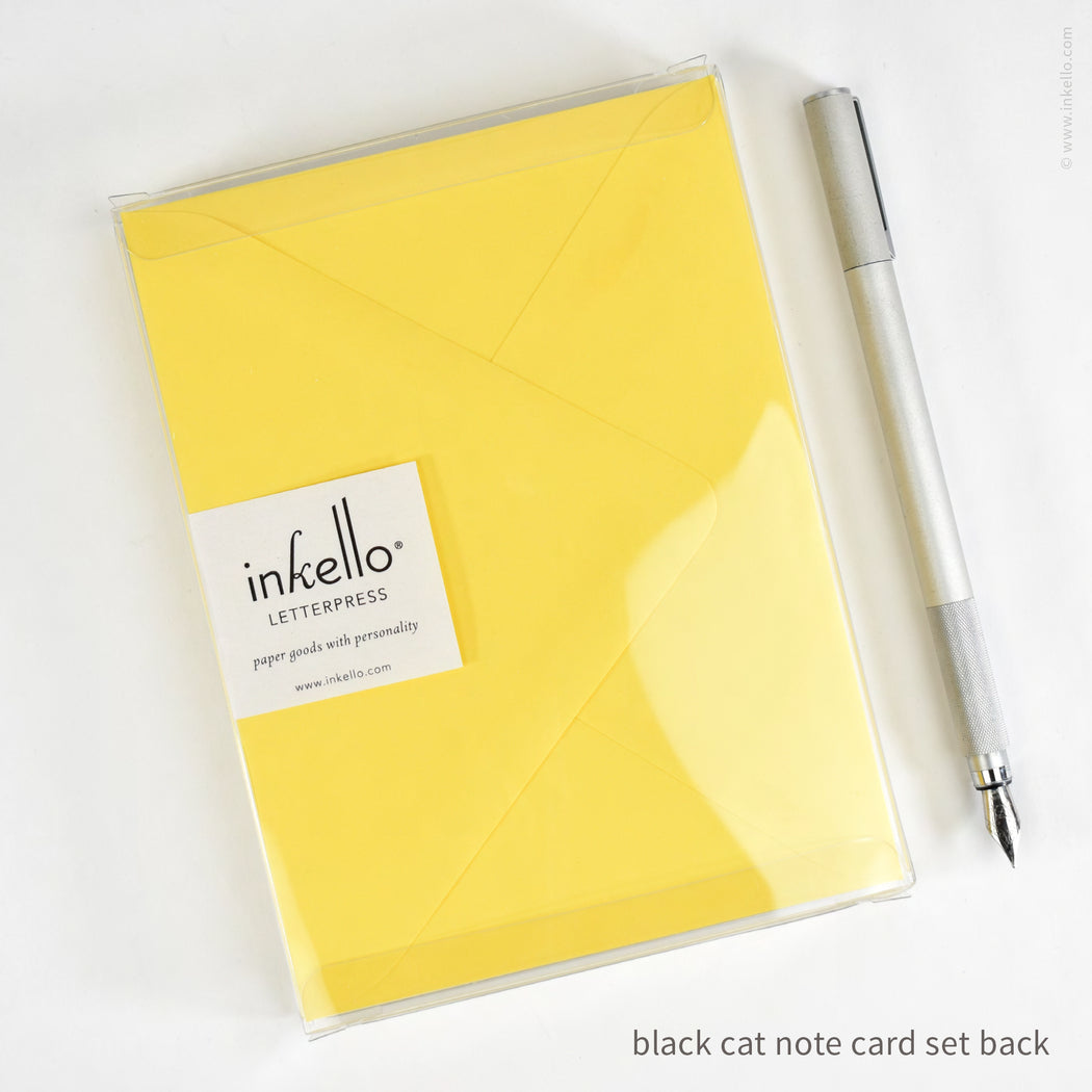 For the love of letter-writing: one dozen flat note cards featuring a cute cat printed in black letterpress ink. Note cards are made of thick, white cotton paper with rounded corners. Coordinating twelve envelopes in canary yellow with a pointed euro flap. Set is enclosed in a clear plastic box.
