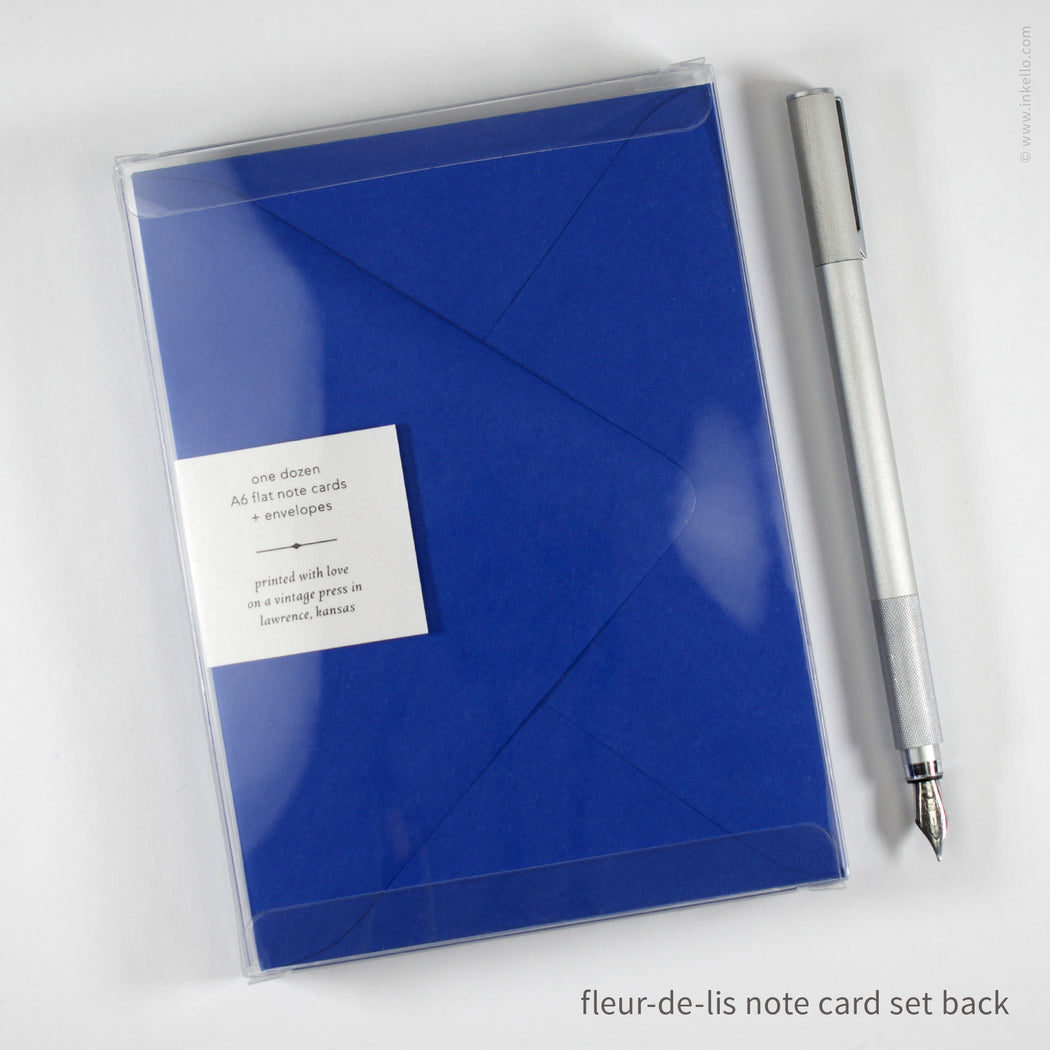 For the love of letter-writing: one dozen flat note cards printed with fleur-de-lis in metallic gold letterpress ink. Note cards are made of thick white paper with a smooth texture and rounded corners. Coordinating twelve envelopes in royal blue with a pointed euro flap. Set is enclosed in a clear plastic box.