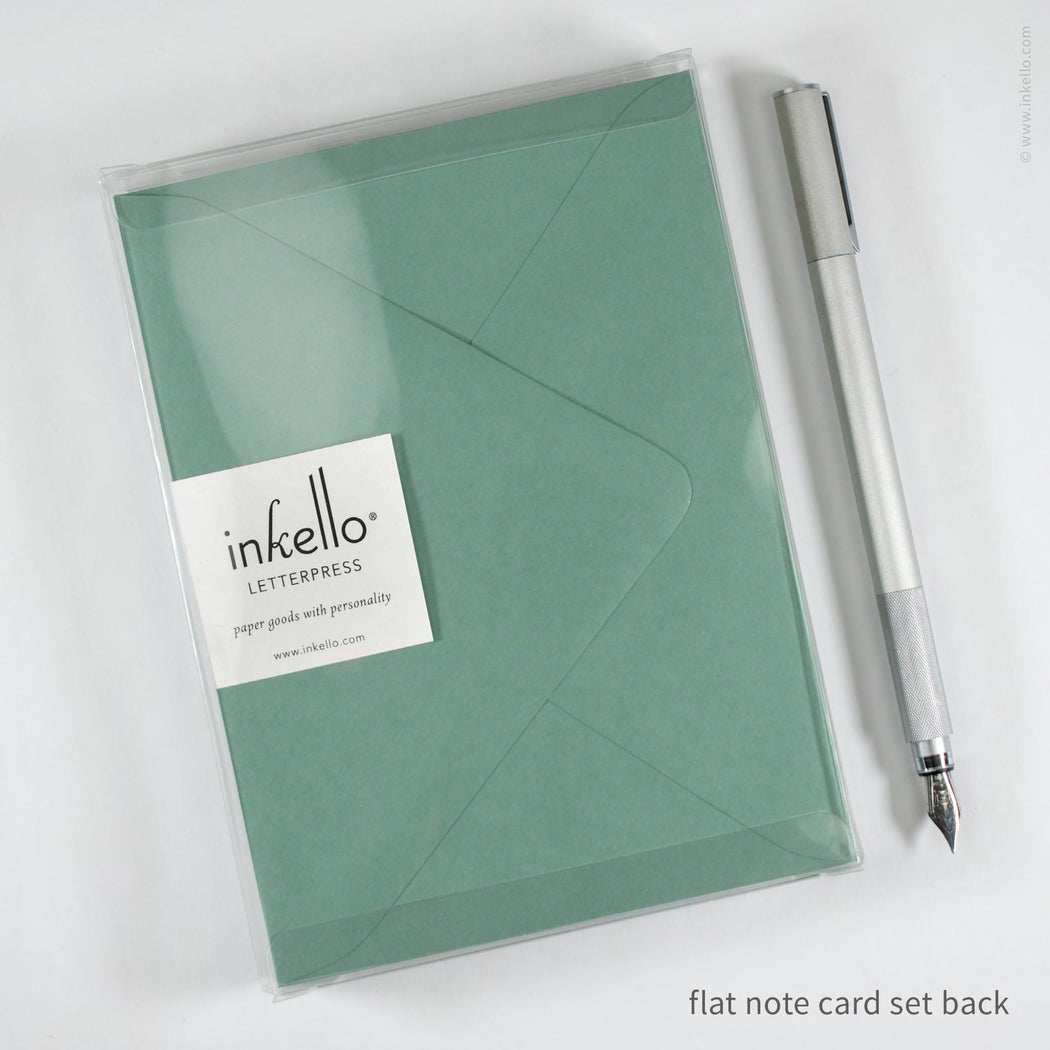 For the love of letter-writing: one dozen flat note cards printed with a group of little green sprouting plants in olive green letterpress ink. Note cards are made of thick white paper with a smooth texture and rounded corners. Coordinating twelve envelopes in sage green with a pointed euro flap. Set is enclosed in a clear plastic box.
