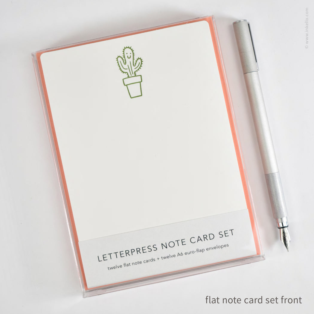 For the love of letter-writing: one dozen flat note cards printed with a smiling succulent in green letterpress ink. Note cards are made of thick white paper with a smooth texture and rounded corners. Coordinating twelve envelopes in coral with a pointed euro flap. Set is enclosed in a clear plastic box.