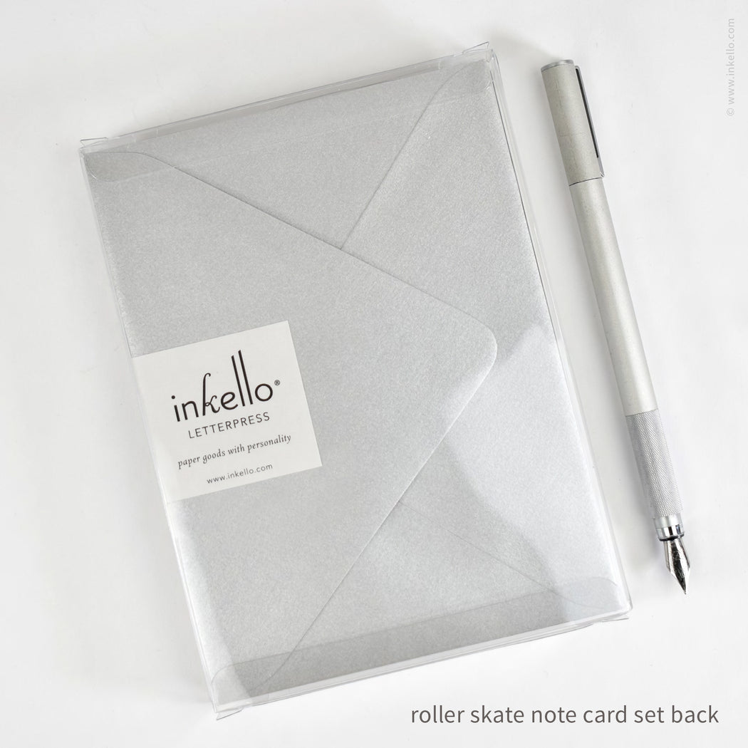 For the love of letter-writing: one dozen flat note cards featuring a roller skate printed in hot pink letterpress ink. Note cards are made of thick, white cotton paper with rounded corners. Coordinating twelve envelopes in metallic silver with a pointed euro flap. Set is enclosed in a clear plastic box.