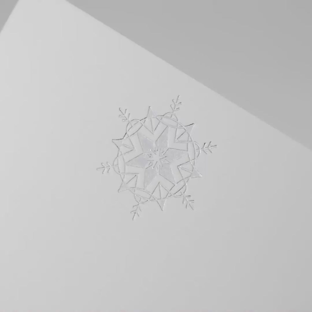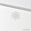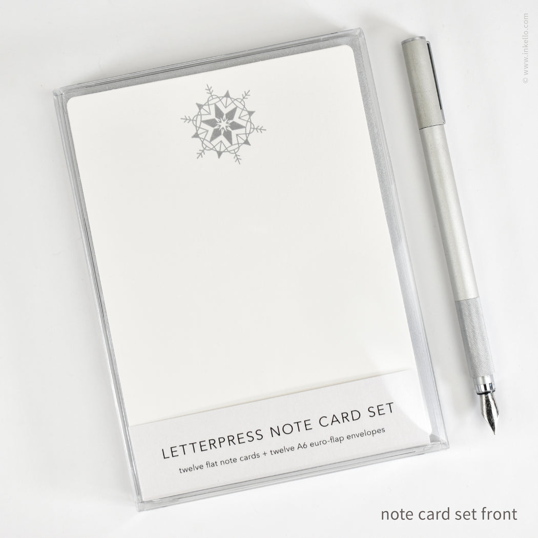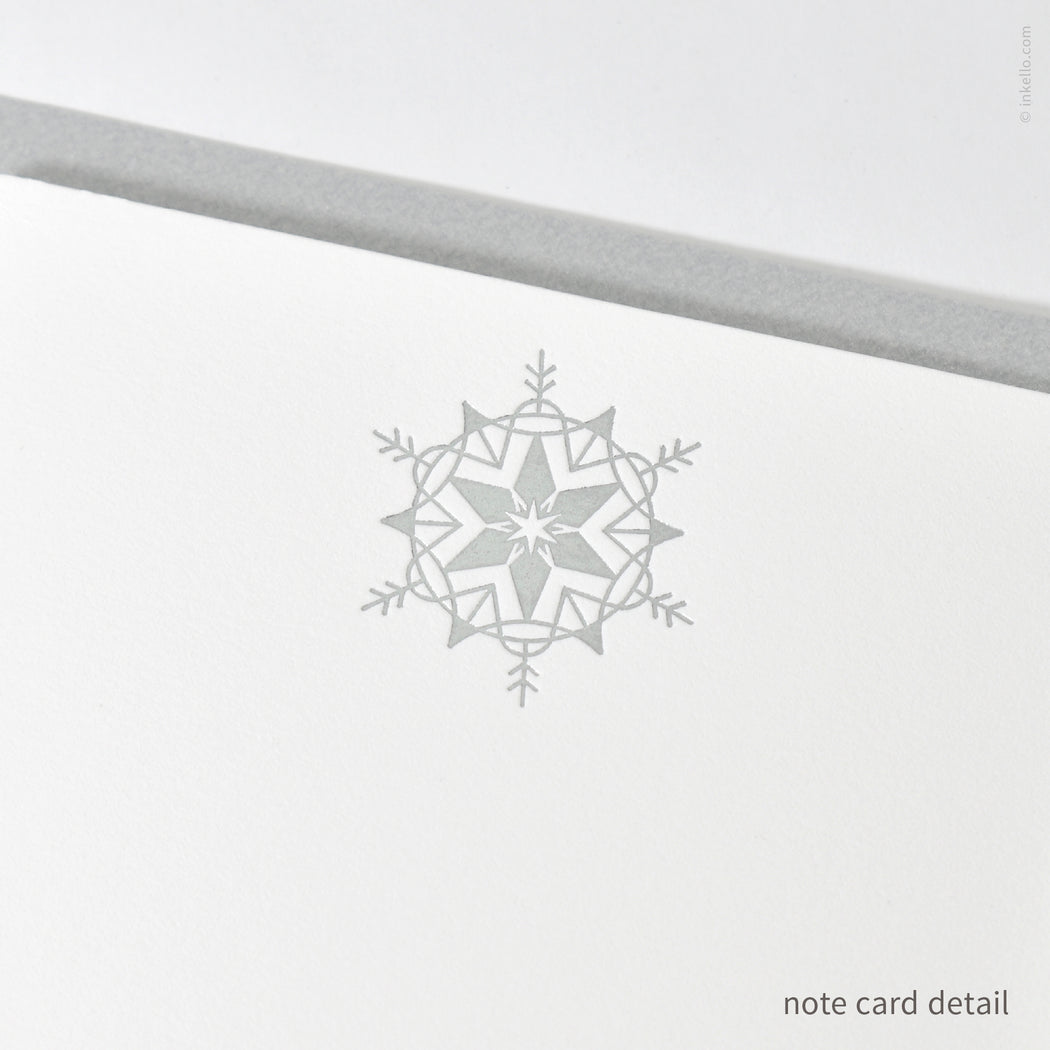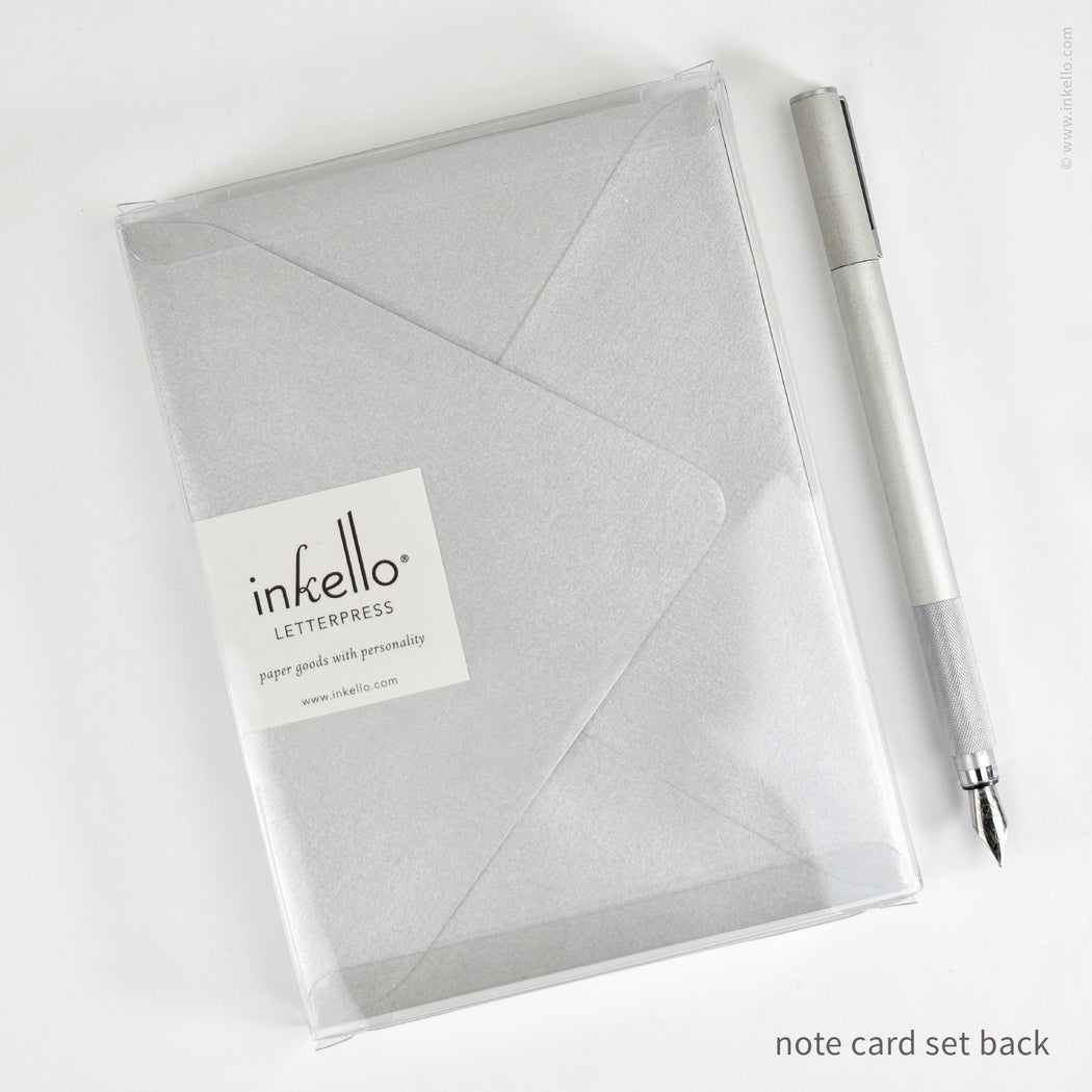 For the love of letter-writing: one dozen flat note cards featuring a silver snowflake printed in matte foil. Note cards are made of thick, white cotton paper with rounded corners. Coordinating twelve envelopes in sparkly silver paper with a pointed euro flap. Set is enclosed in a clear plastic box.