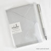 Materials: white 300 gsm 100% cotton cover-weight paper for note cards, text-weight envelopes in metallic silver paper, clear plastic box