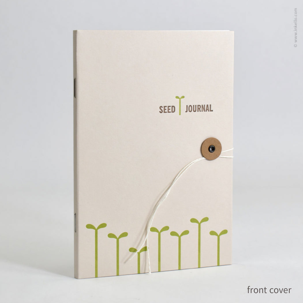 Front: "Seed Journal" and green seedlings letterpress-printed in brown and green inks, paper button