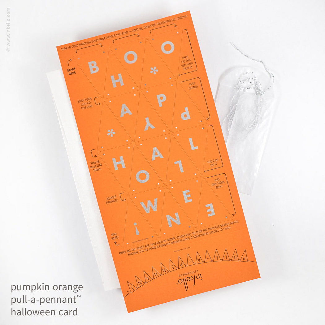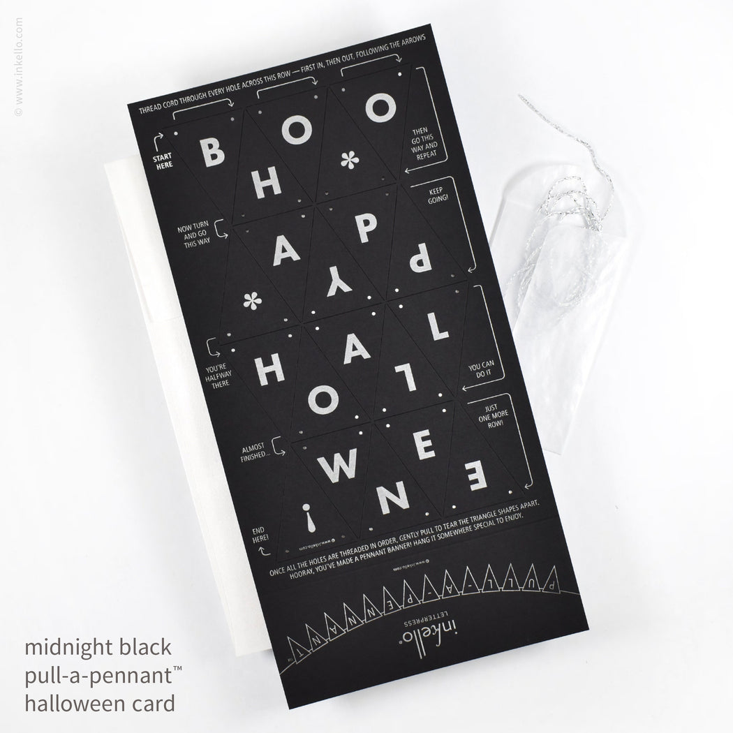 Available in midnight black or pumpkin orange. Comes with a large pearlescent white envelope for mailing, and mails with a regular first class forever stamp. Also includes a sparkly silver string with aglets (cut just the right length for the banner) in a small glassine envelope.