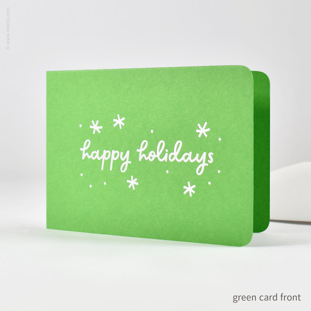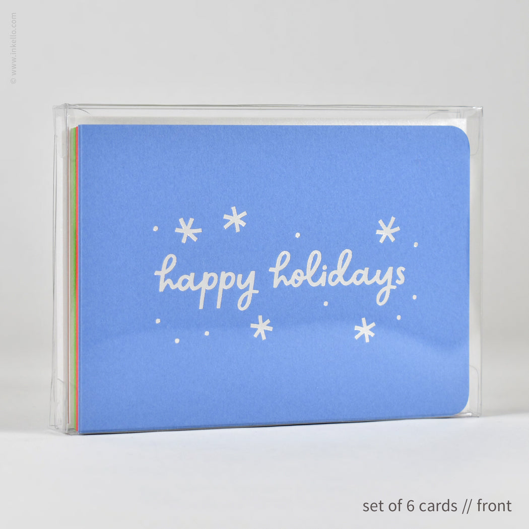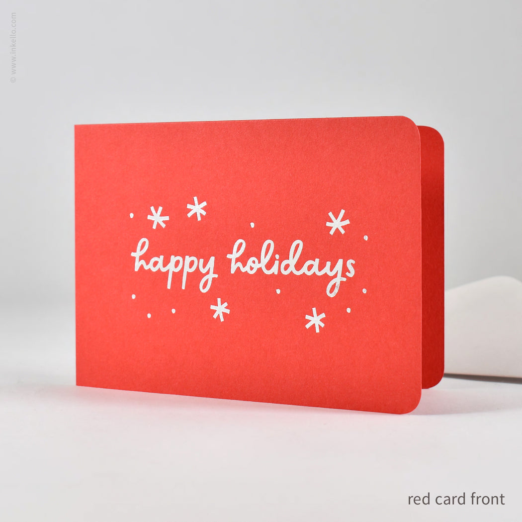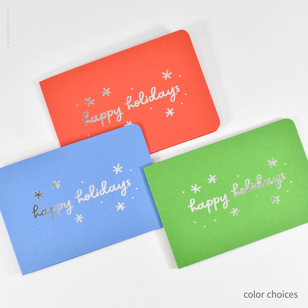 Bright, seasonal small card with simple snowflakes and "happy holidays" message printed in shiny silver foil on red, green or blue paper. Inside is blank. Envelope is white pearlescent paper, with a deeply pointed flap. Available as a single card or in a set of six cards (two each of red, green and blue colors).