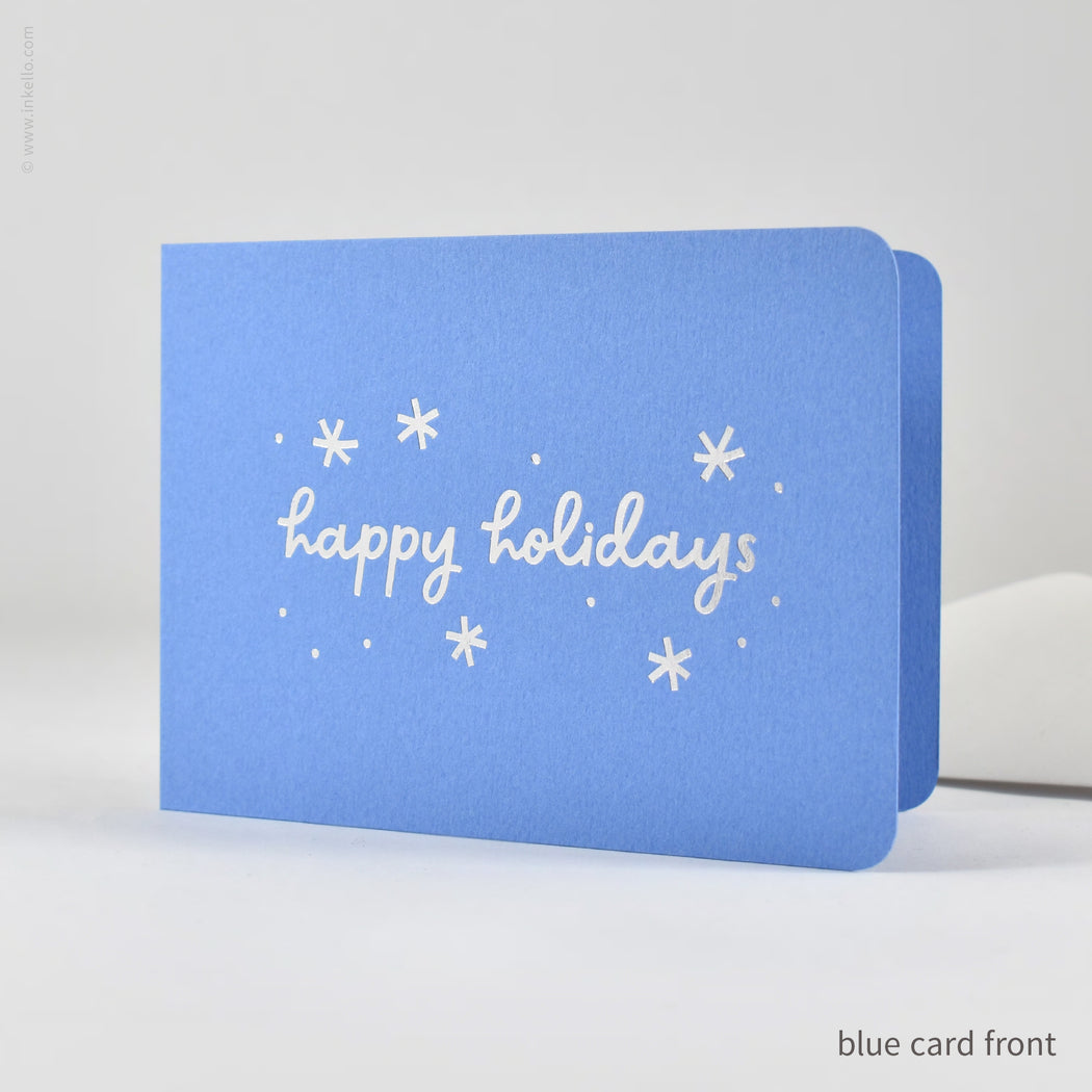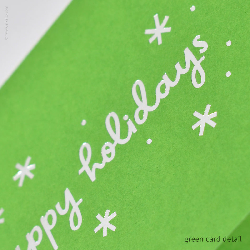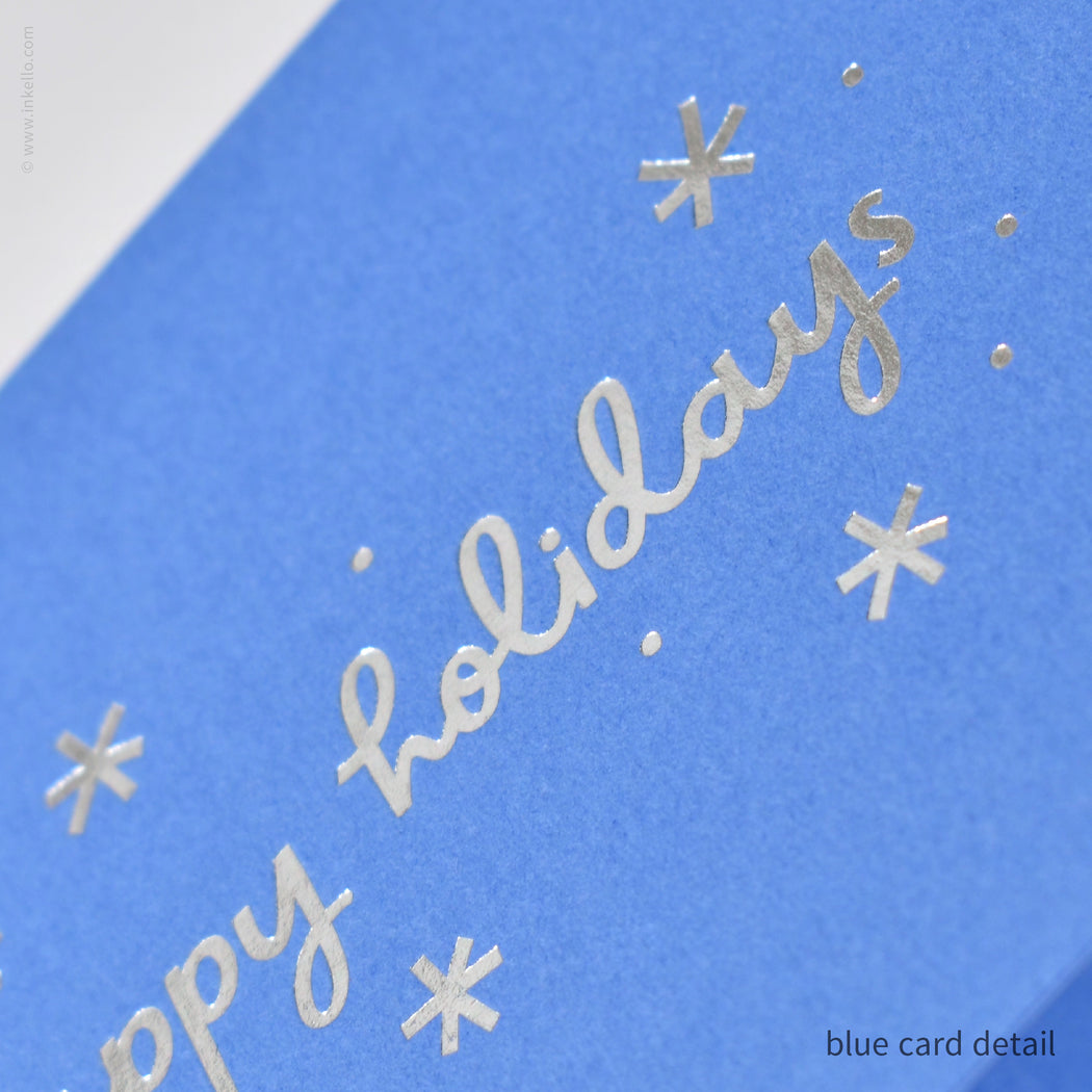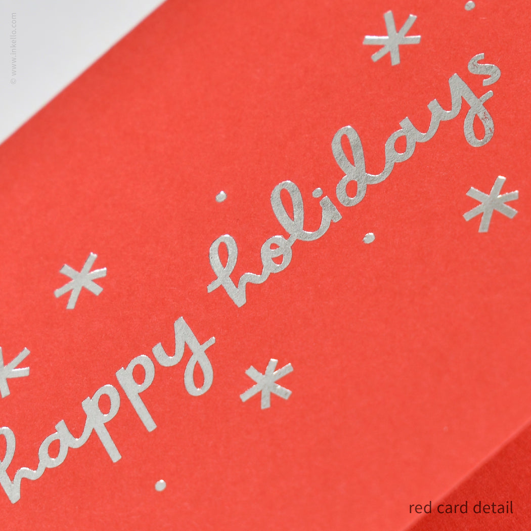 Card front: "happy holidays," snowflakes and dots printed with silver hot foil