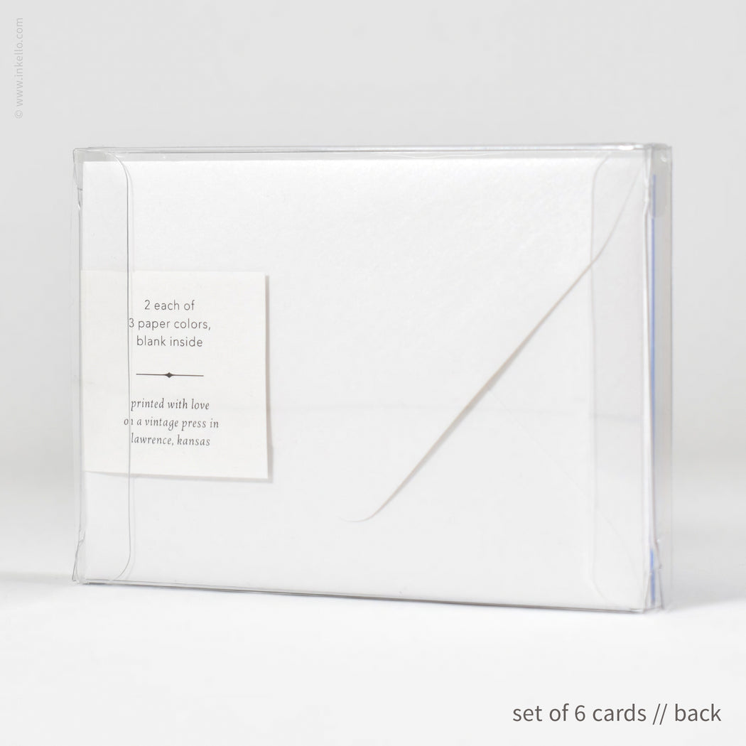Materials: cover-weight paper for note cards (three colors), text-weight envelopes, set of six option is enclosed in a clear plastic box