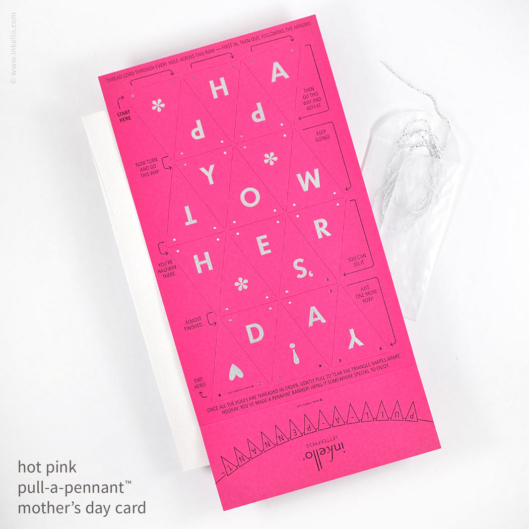 Front of card: *HAPPY*MOTHER’S*DAY!♡ in metallic silver ink, Pull-A-Pennant™ directions in black ink