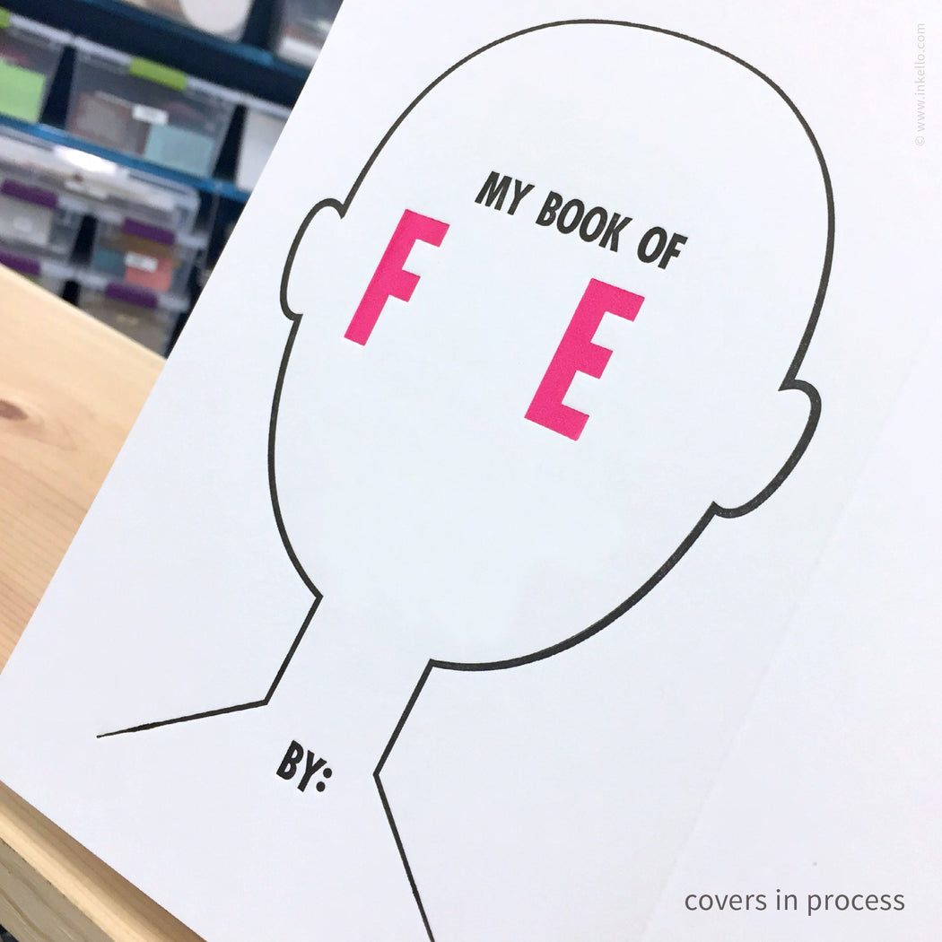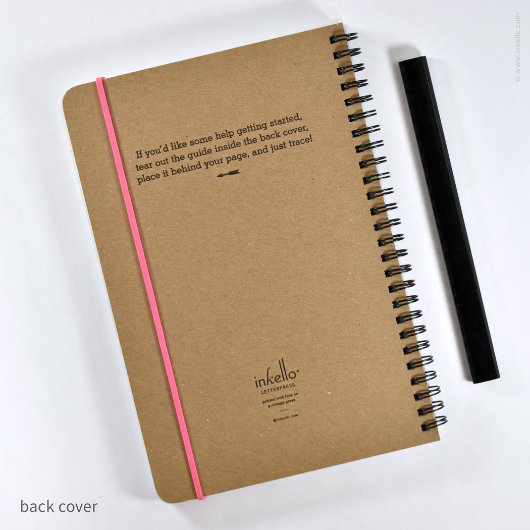 Materials: thick white paper for front cover, text-white paper for inside pages, sturdy chipboard back cover, black wire-O spiral binding, unsharpened carpenter pencil (color varies), large rubberband (color varies)