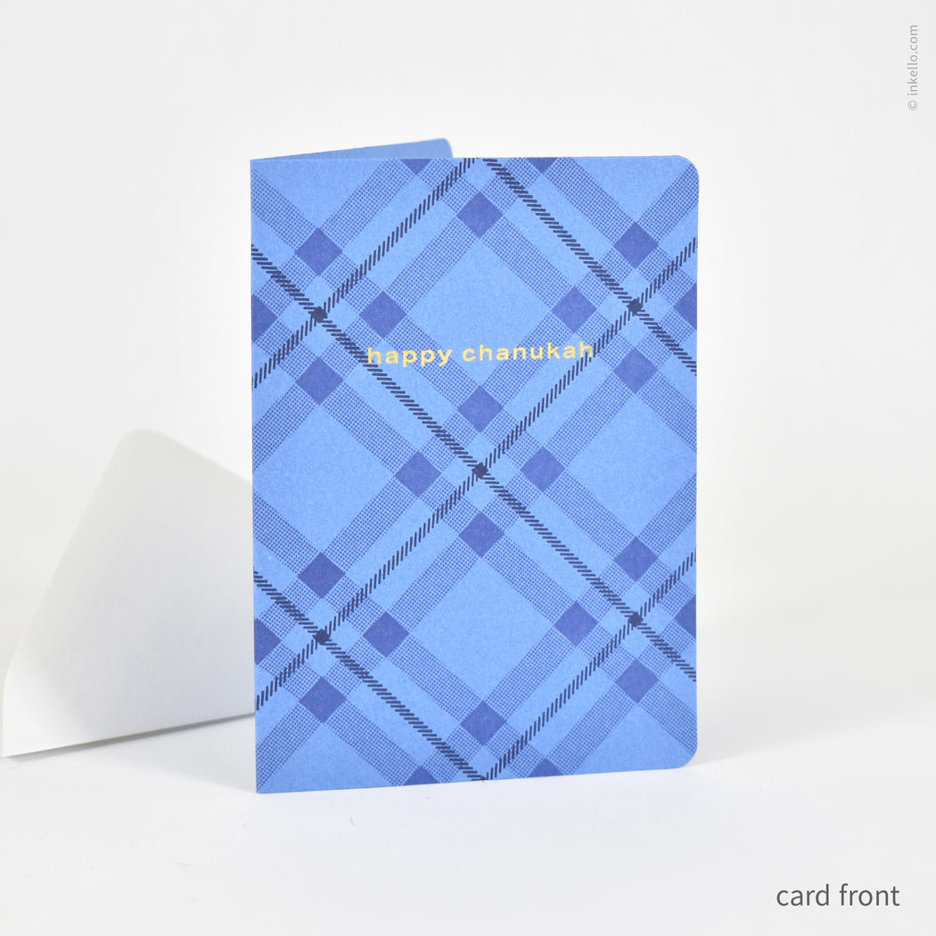Cheery small seasonal card with layered plaid pattern and "happy chanukah" message printed in shiny gold foil on perwinkle blue paper. Card front is printed with transparent lavender and navy inks that combine with the paper color to make a cozy plaid pattern. Inside is blank. Envelope is white pearlescent paper, with a deeply pointed flap.