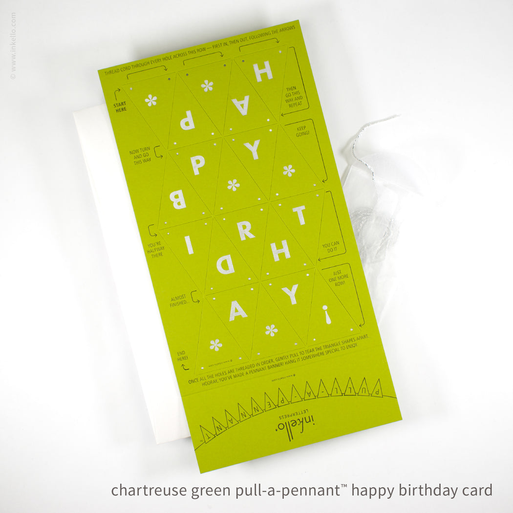 Send joy in an envelope with this innovative and interactive birthday card! Once the recipient threads the string through the holes in the card and pulls, the little triangles separate and line up in the right order to spell "Happy Birthday!" on a mini hangable banner. It's a memorable way to celebrate the occasion and sure to be a keeper.