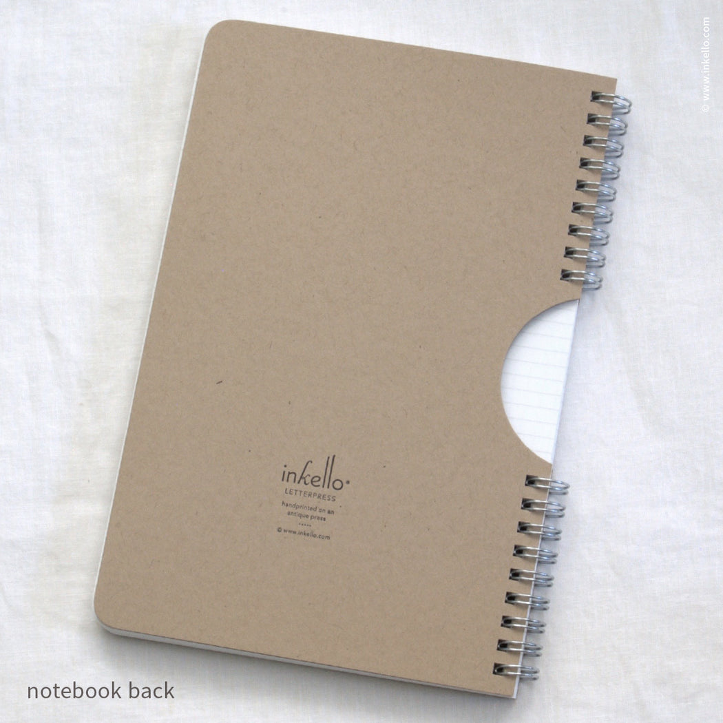 Materials: doubled heavy kraft paper for front and back covers; 55 interior pages in your choice of blank or lined/graph white paper; silver-tone wire-O spiral binding