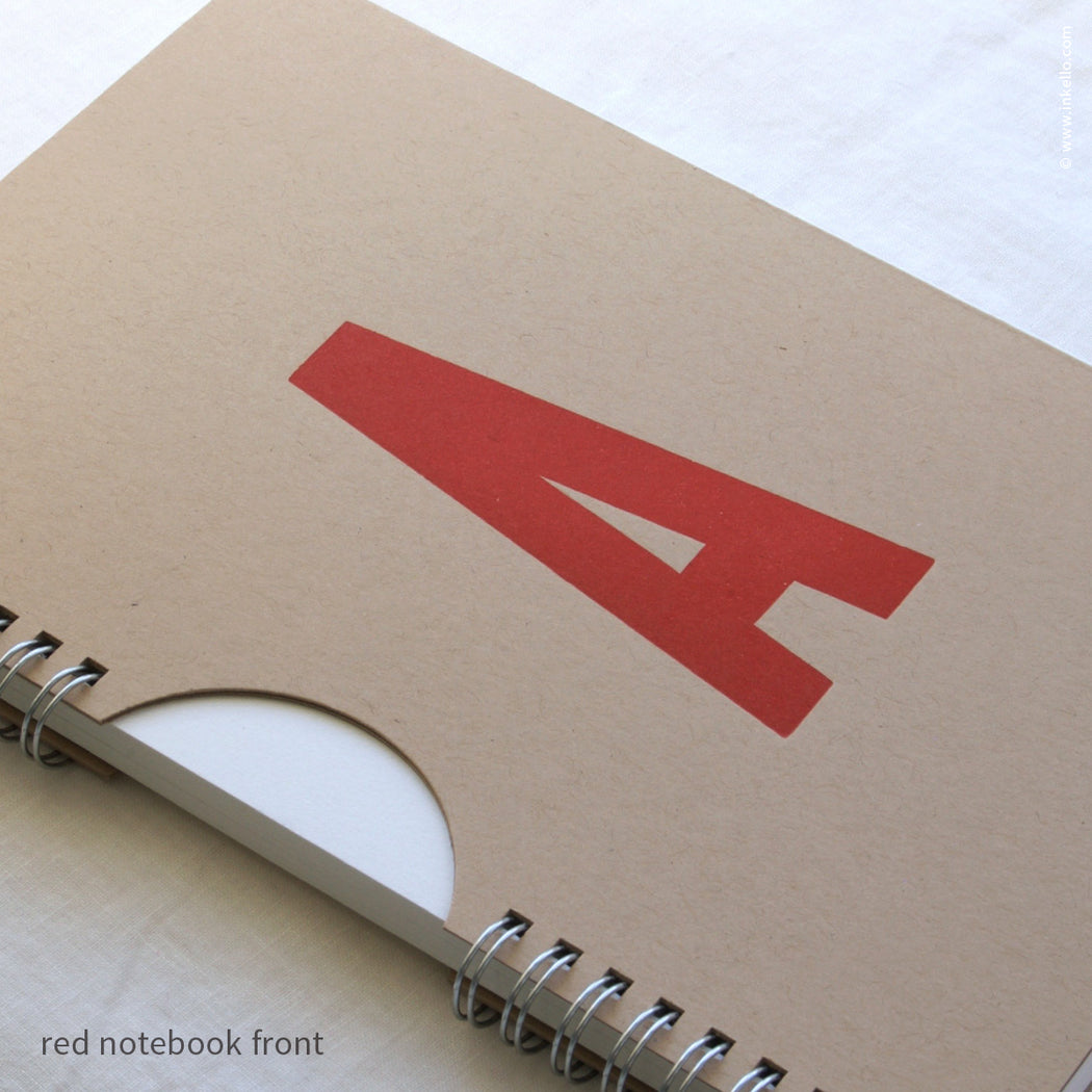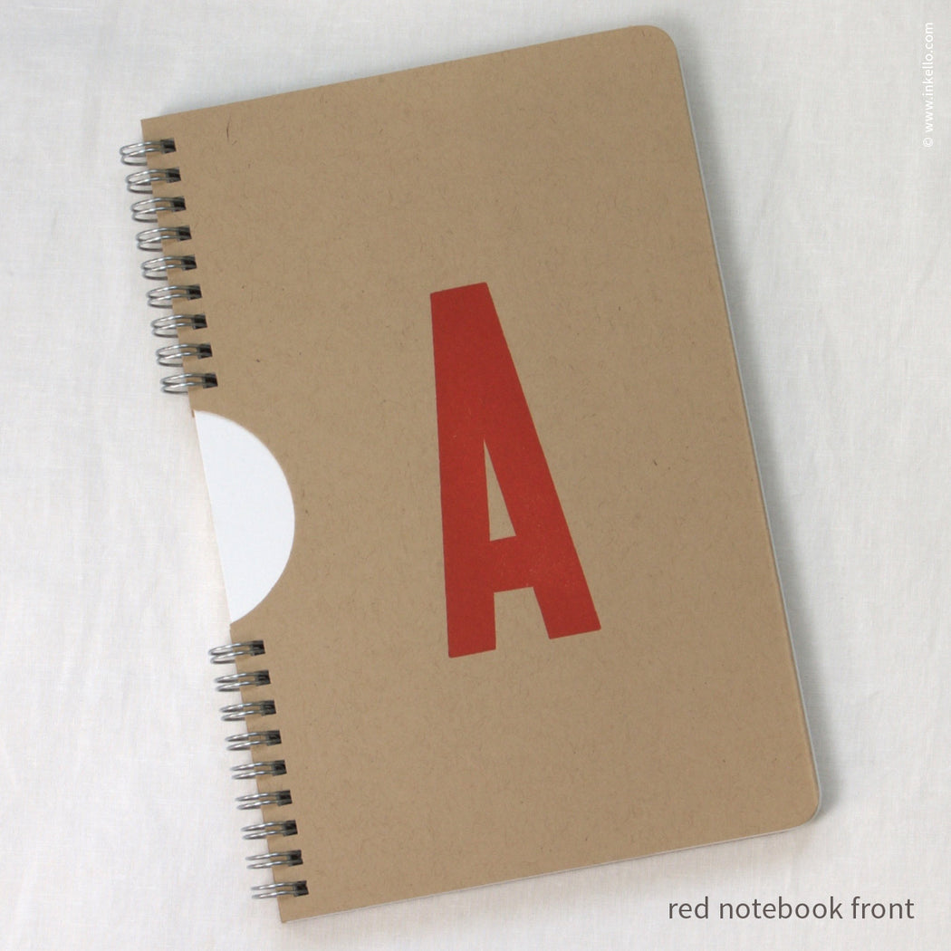Simple, bold, monogrammed spiral notebook printed in red letterpress ink with vintage wooden type on a brown kraft cover. Half-moon cut-out along spiral-bound edge.