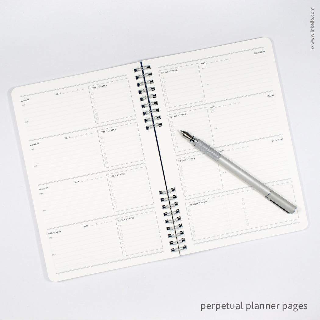 - Perpetual weekly calendar: white pages that start on any date (56 pages)