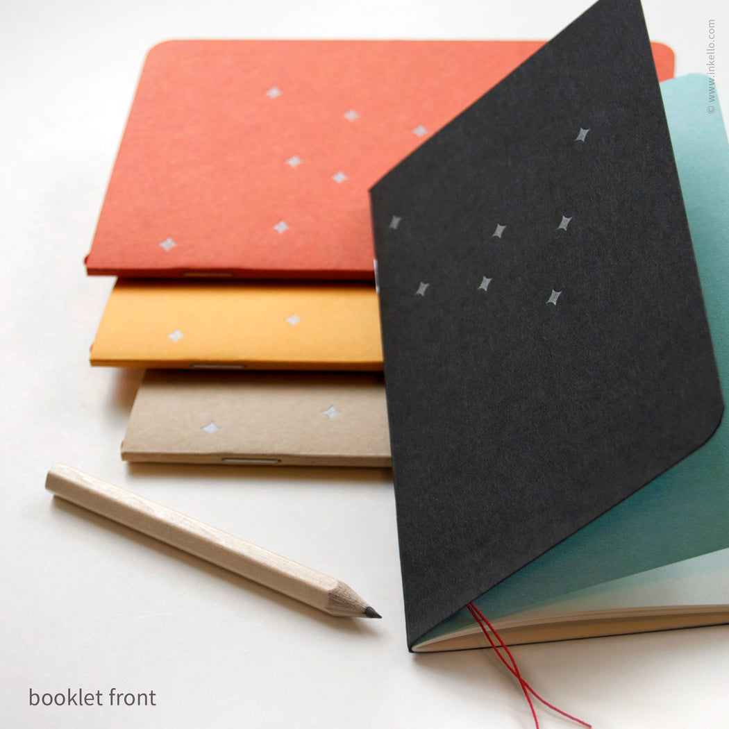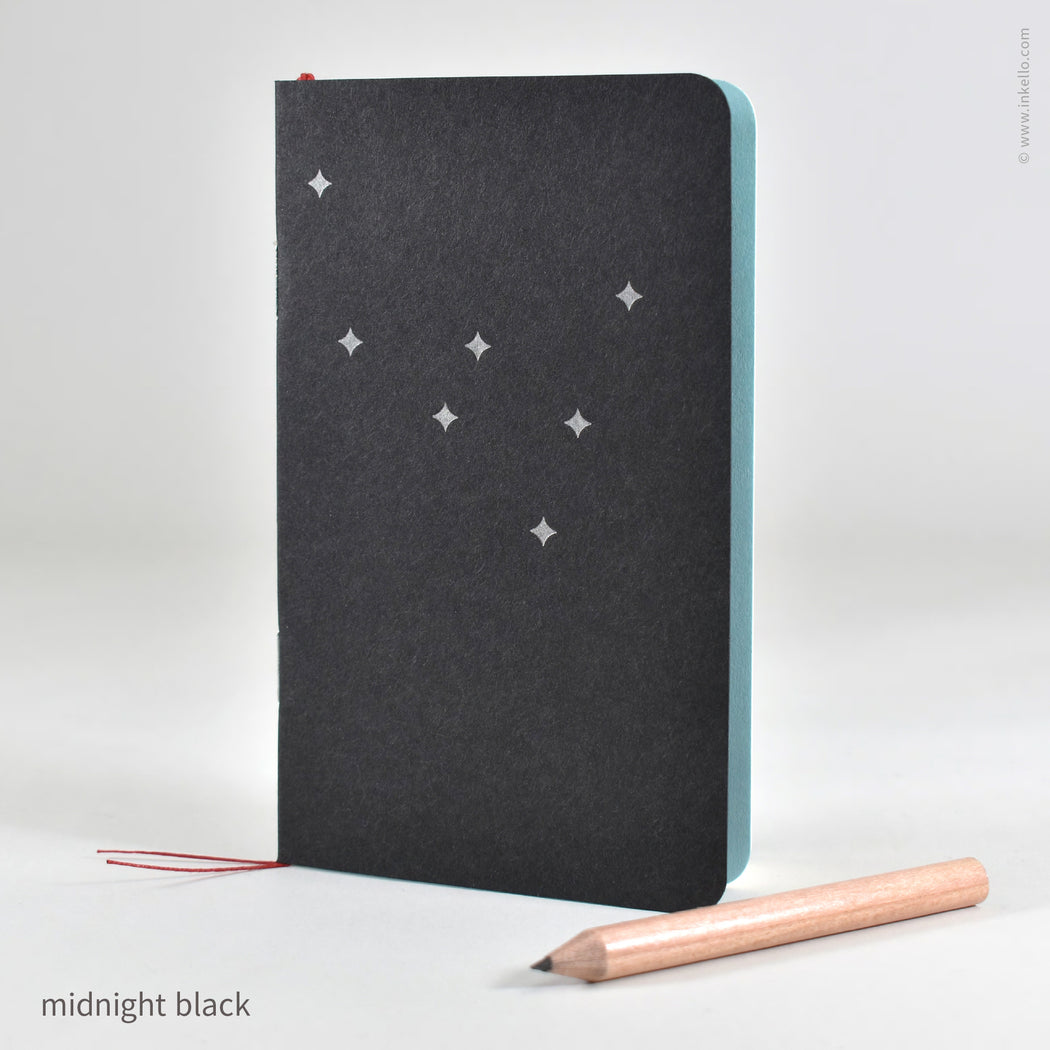 Letterpressed silver stars twinkle on this paper booklet which is perfect for both drawing and writing. Choose from a midnight black, tomato red, mustard yellow, or khaki brown cover. Endpapers are a contrasting pool blue color, printed with more silver stars and lines. Twelve blank creamy white pages inside with an attached, thin, red bookmark. Includes a small pencil. Choose from four cover color choices.