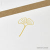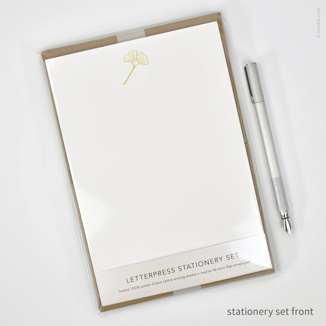 For the love of letter-writing: twelve stationery sheets printed with a ginkgo leaf printed in yellow ochre letterpress ink. Stationery writing sheets are 100% cotton with luxurious texture. One dozen envelopes in brown kraft paper with a pointed euro flap. Packaged in a cellophane bag.