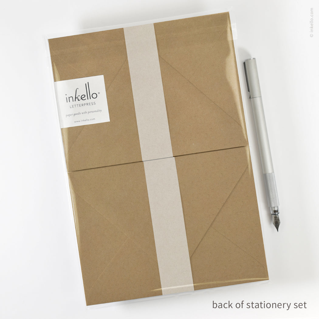 Materials: white 100% cotton text-weight paper for stationery sheets, text-weight envelopes in brown kraft paper, cellophane bag