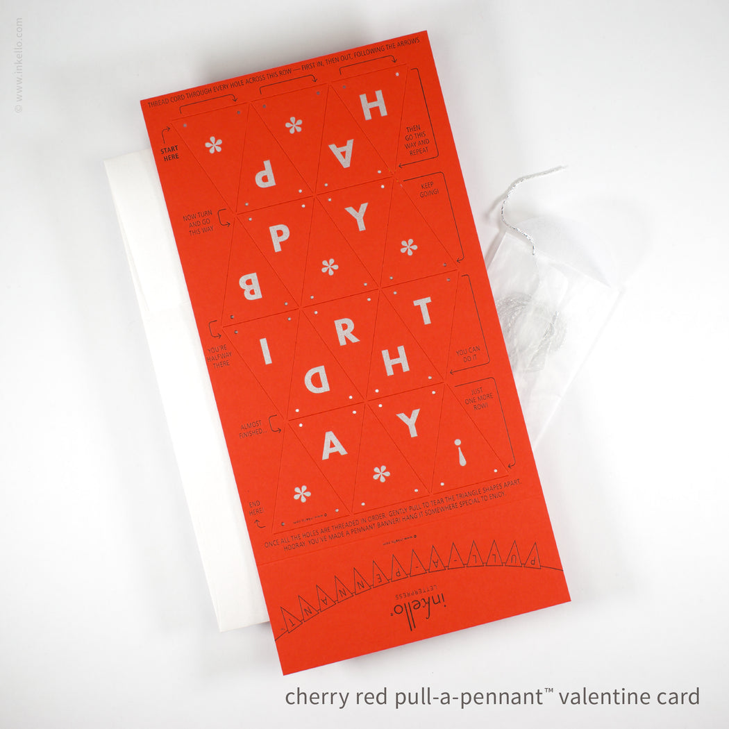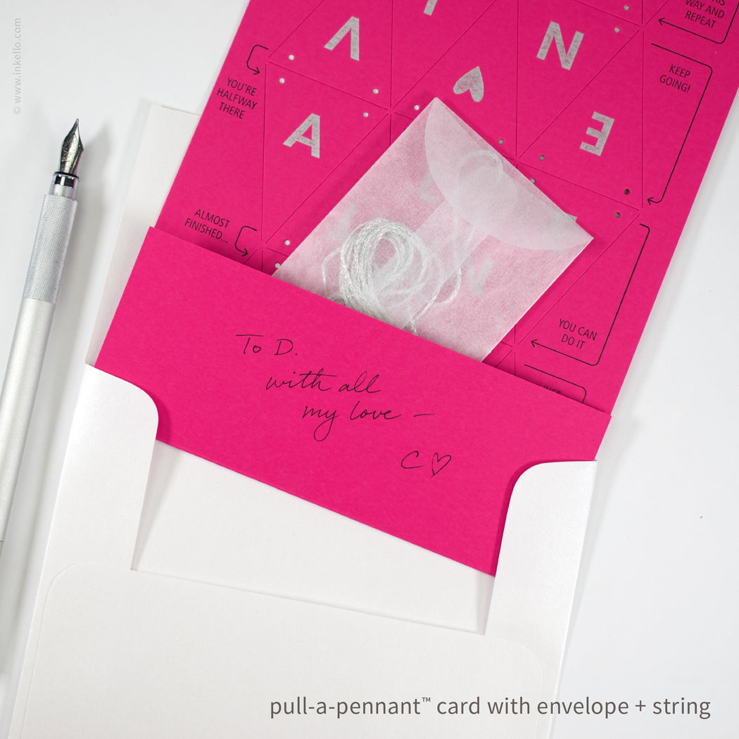 Available in hot pink or cherry red. Comes with a large pearlescent white envelope for mailing, and mails with a regular first class forever stamp. Also includes a sparkly silver string with aglets (cut just the right length for the banner) in a small glassine envelope.