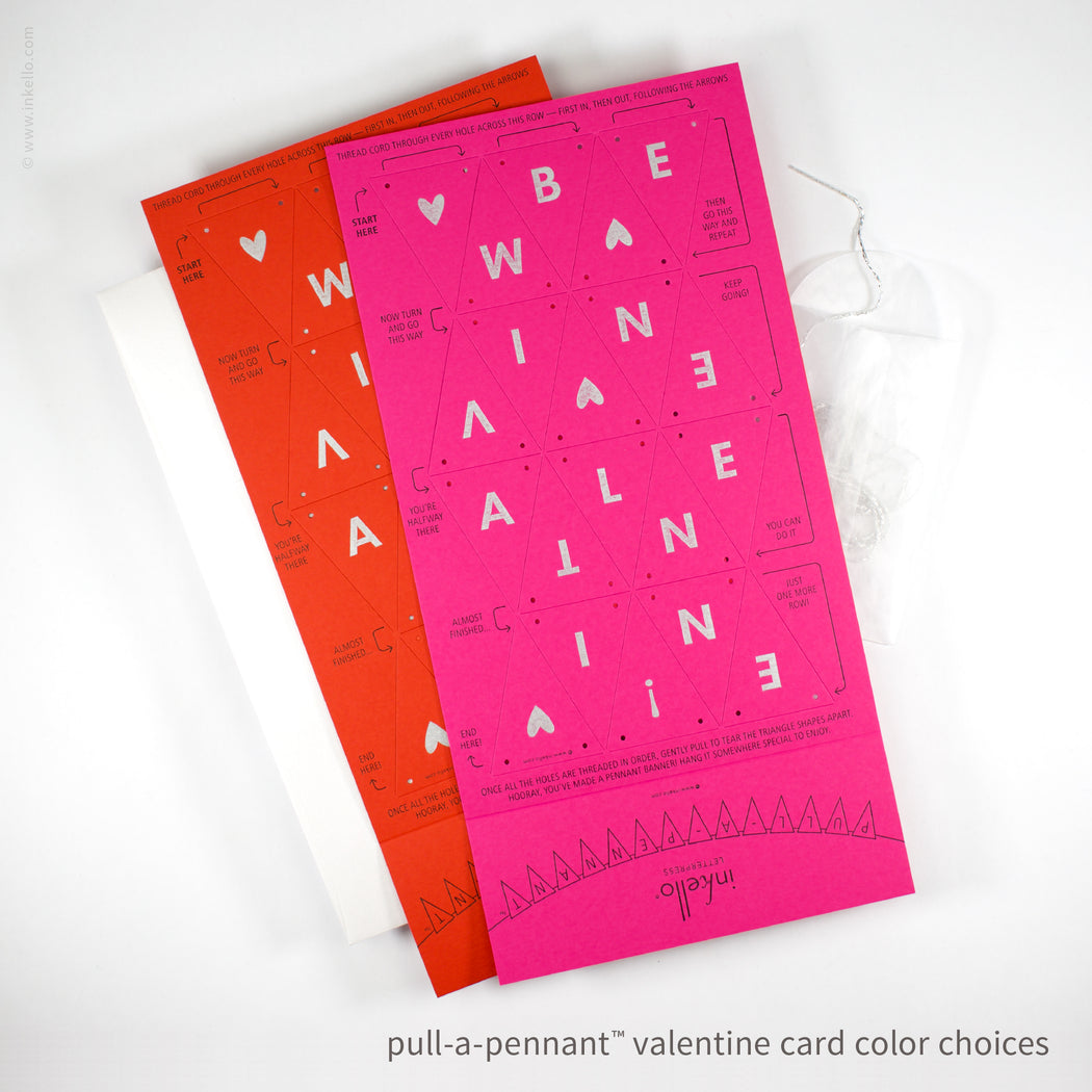 Front of card: ♡BE♡MINE♡VALENTINE!♡ in metallic silver ink, Pull-A-Pennant™ directions in black ink