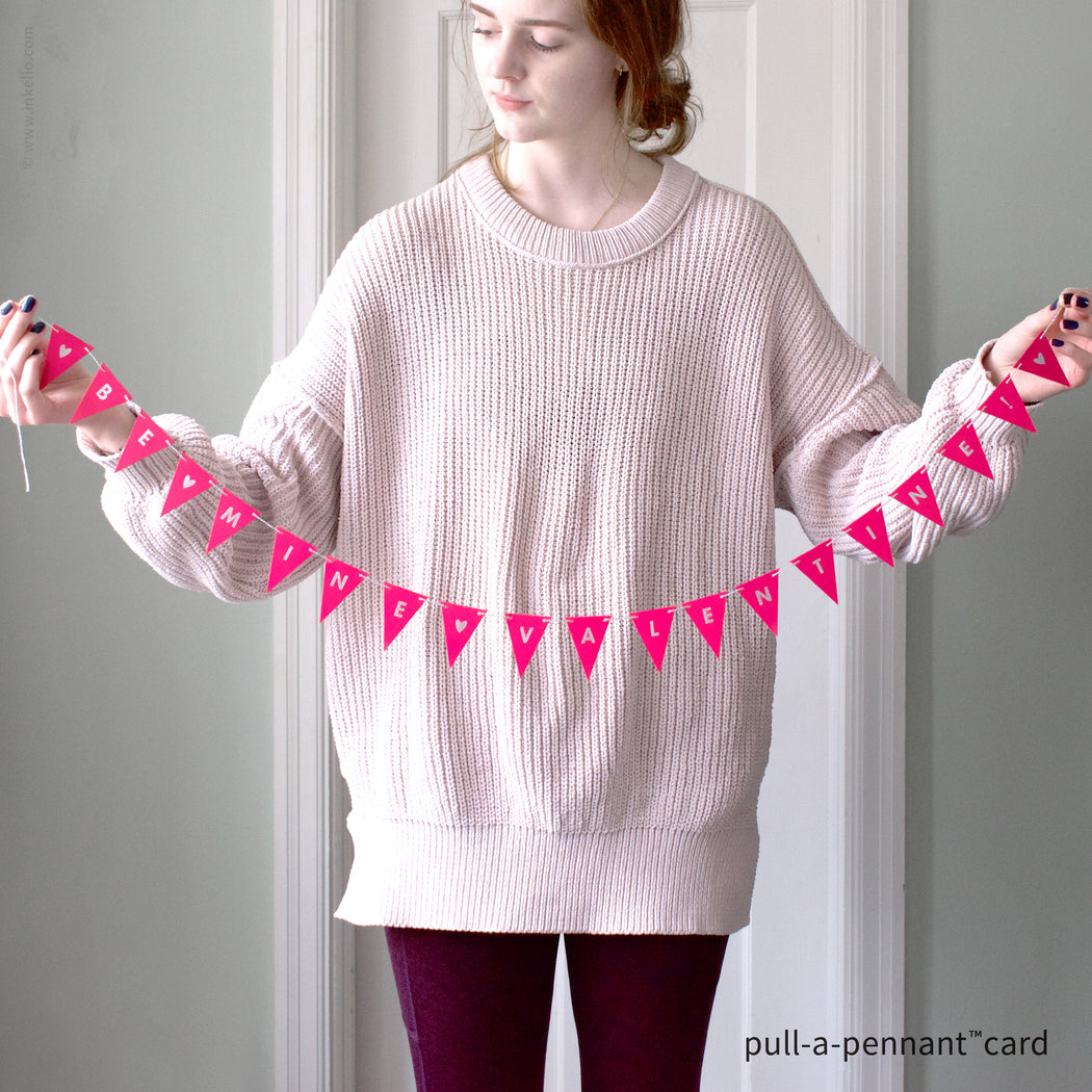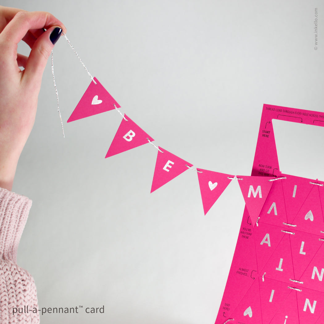 Send joy in an envelope with this innovative and interactive valentine! Once the recipient threads the string through the holes in the card and pulls, the little triangles separate and line up in the right order to spell "Be Mine Valentine!" on a mini hangable banner. It's a memorable way to celebrate love and sure to be a keeper.